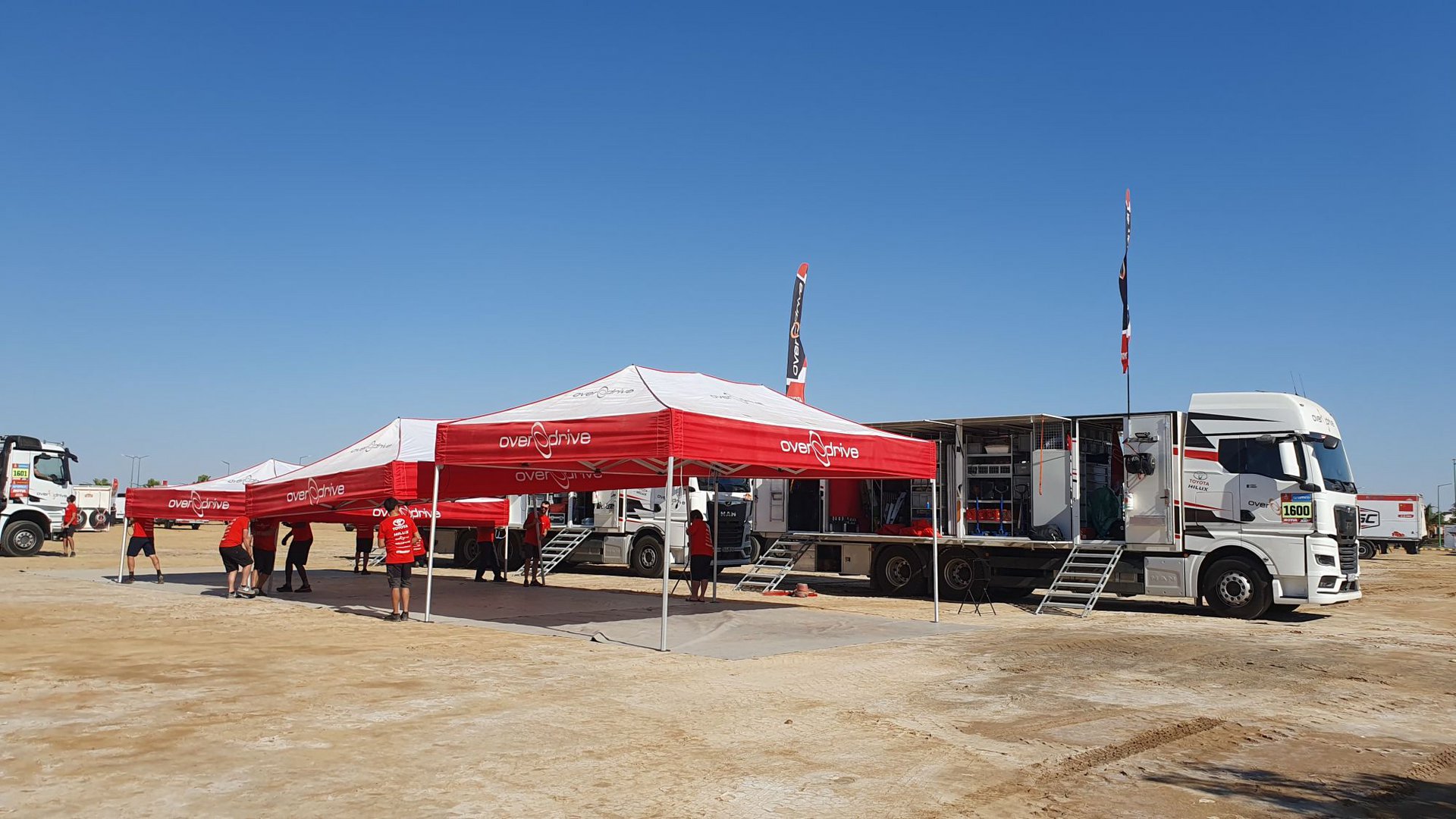 Στον κυρίως χώρο, περιλαμβάνονται τεράστιες τέντες για το εστιατόριο, τους δημοσιογράφους, το νοσοκομείο, την τηλεόραση, καθώς και οι τουαλέτες, τα μπάνια, τα φορτηγά HD για το μοντάζ, οι χώροι για τις απονομές, οι lounge χώροι για άραγμα και οι τέντες τύπου βεδουϊνου για καφέ και τσάι. Σε παρακείμενους χώρους βρίσκονται χωρισμένες οι εργοστασιακές και ιδιωτικές ομάδες, των μοτοσυκλετών, των αυτοκινήτων, των φορτηγών, των SSV, των ATV.