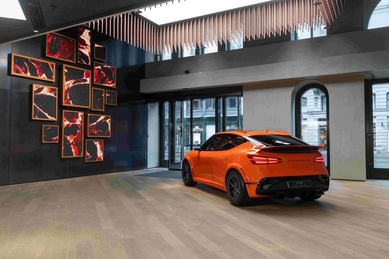 Το GV60 Magma Concept, το πρώτο μοντέλο Magma της μάρκας που θα μπει επίσημα στην παραγωγή το επόμενο έτος, εκτίθεται στο ισόγειο του στούντιο Genesis.
