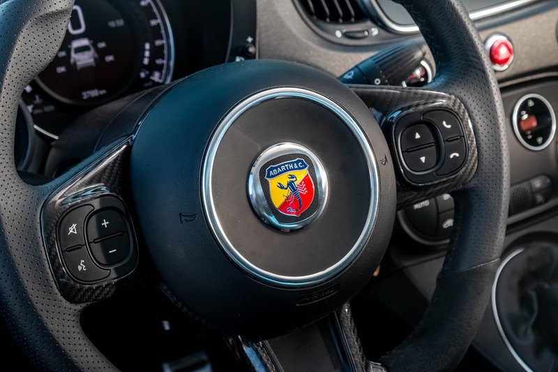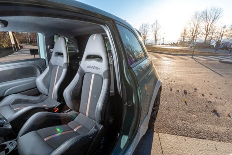Η ξεχωριστή εμφάνιση ολοκληρώνεται από διάφορα αυτοκόλλητα σε χρώμα γκρι Campovolo (όλα έχουν την σημασία τους σε ένα Abarth), την εξάτμιση Record Monza που μπορεί να μη διαθέτει το όνομα Akrapovic του esseesse, αλλά μάλλον έχει πιο «αντρικό» ήχο και τους πολύ όμορφους τροχούς των 17 ιντσών με τις κόκκινες δαγκάνες της Brembo (τετραπίστονες εμπρός) σε δίσκους 305 mm εμπρός και 240 mm πίσω.