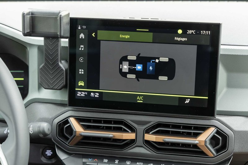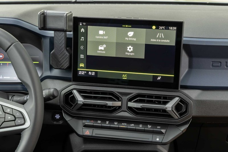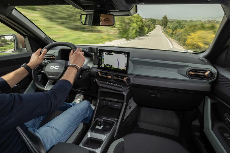 Η οποία καμπίνα είναι Dacia όπως πάντα αλλά πολύ πιο φροντισμένη και φορτωμένη με μπόλικη τεχνολογία. Μια μεγάλη οθόνη 10,1" στραμμένη κατά 10° προς τον οδηγό δίνει τον τόνο ενός οδηγοκεντρικού περιβάλλοντος μαζί με τον νέο επίσης ψηφιακό πίνακα οργάνων 7". Και ομοίως νέο πεπλατυσμένο τιμόνι (μεταξύ μας, δείχνει ωραίο αλλά μάλλον αχρείαστο είναι σε ένα SUV).