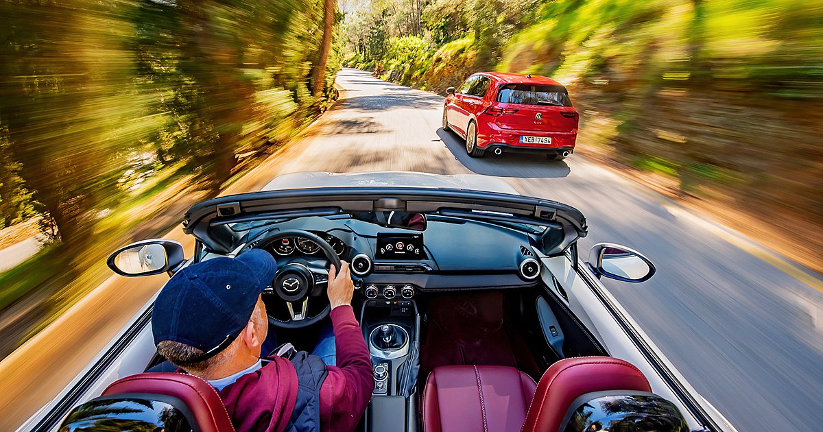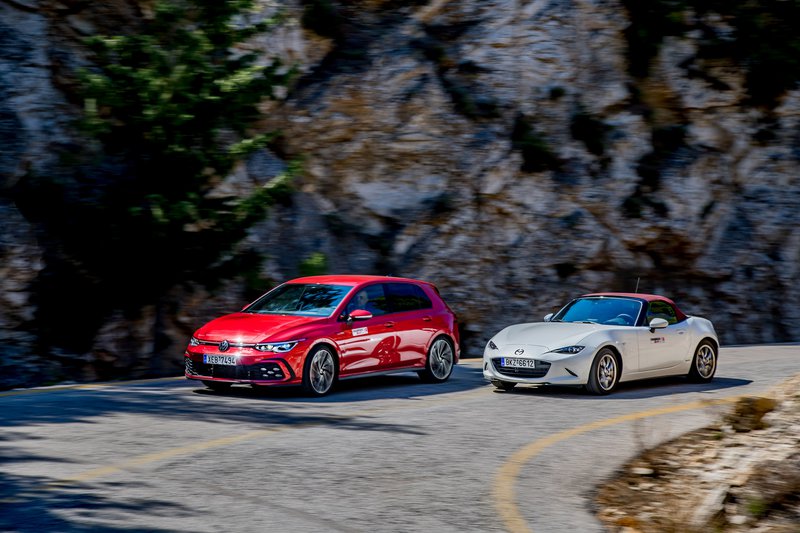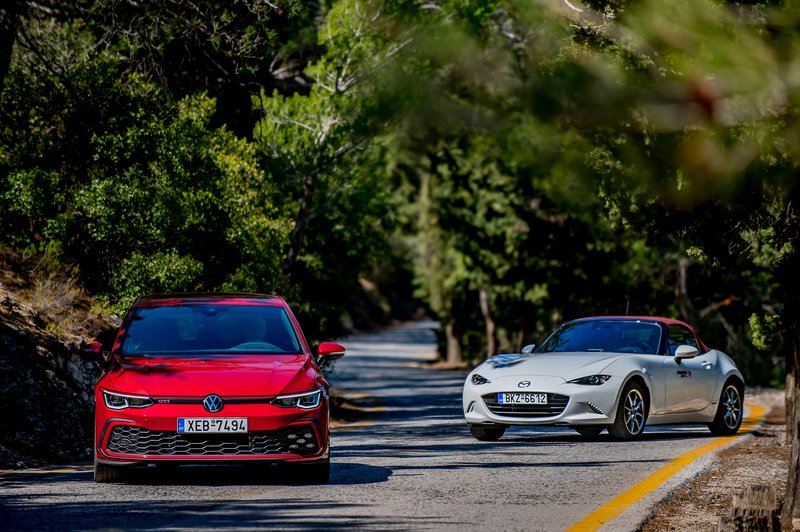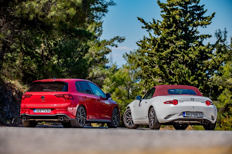 Το κιβώτιο διπλού συμπλέκτη, για παράδειγμα, ορίζει τον απόλυτο ρυθμό και όχι ο οδηγός. Και, βέβαια, με τόση φροντισμένη σχεδίαση και υλοποίηση και με αεροδυναμικό συντελεστή 0,275, μπορείς να υπολογίζεις το Golf GTI ως ένα Grand Tourer τσέπης και με Travel Assist, τον ψηφιακό μας προστάτη για ταχύτητες μέχρι 210 km/h από τα συνολικά 250 km/h που μπορεί να αγγίξει το αυτοκίνητο μέχρι να επέμβει ο ηλεκτρονικός κόφτης. Θα μπορούσαμε να ανεβοκατεβαίνουμε ολημερίς με τούτα τα δύο τόσο μα τόσο πλήρη αυτοκίνητα, το MX-5 και το Golf GTI. Πλήρη σε ιστορία, σε μηχανολογία, σε χαρακτήρα, σε επιδόσεις στην αίσθηση ότι μπορείς ακόμα να χαίρεσαι οδηγώντας. Κι όχι ό,τι κι ό,τι αλλά δύο από τα μοντέλα που σημάδεψαν την κατηγορία τους, επειδή υπήρχαν πίσω από αυτά άνθρωποι, μηχανικοί, σχεδιαστές που ήθελαν το κάτι παραπάνω. Πάντα τέτοια.