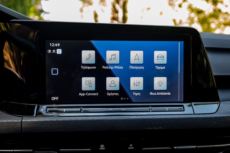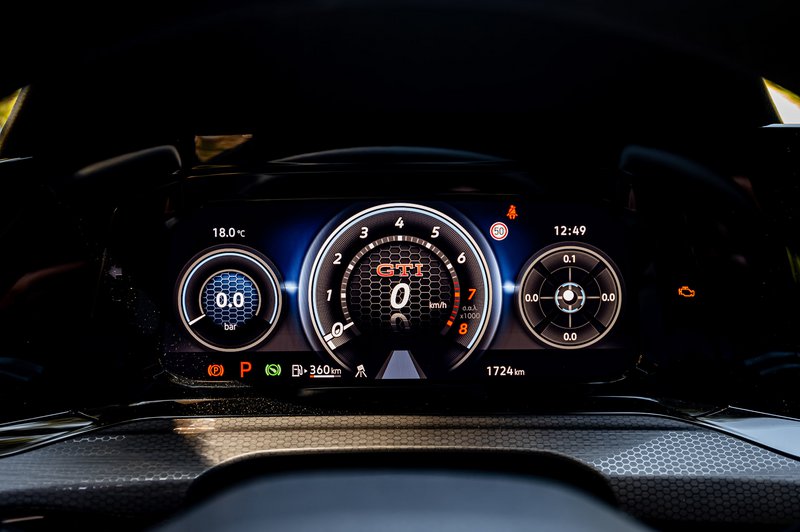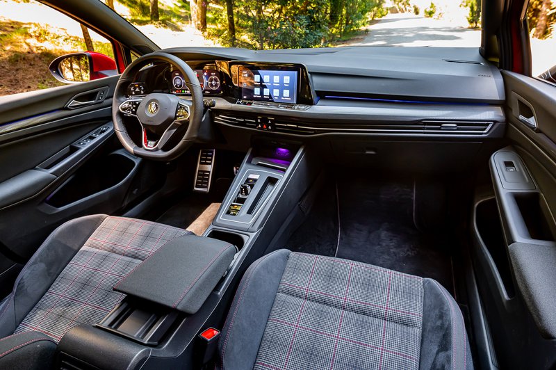 Α! Και στο εσωτερικό η καρώ επένδυση, όπως πάντα για Golf GTI, αλλά όλα τα άλλα τόσο μα τόσο σημερινά! Ψηφιακός πίνακας οργάνων και μεγάλη οθόνη αφής (“Innovision Cockpit”, ονομάζει η VW την ενιαία μονάδα ψηφιακού πίνακα οργάνων και οθόνης πολυμέσων 10 ιντσών), φλύαρο στην όψη (αλλά ευτυχώς όχι στην αίσθηση), πλήρες συστημάτων και λειτουργιών τιμόνι και ελάχιστοι διακόπτες που φροντίζουν για τα βασικά, όπως είναι, λόγου χάριν, η σε πολλές βαθμίδες παραμετροποίηση απόδοσης κινητήρα, αίσθησης τιμονιού και λοιπόν συστημάτων μέσα από προγράμματα παραμετροποίησης. Μα λείπει, μας λείπει πολύ, όμως, ο επιλογέας του μηχανικού κιβωτίου, καθώς η drive-by-wire εποχή «κτύπησε» και το GTI με ένα λεβιεδάκι τόσο δα να επιτελεί (μαζί με τα απαραίτητα paddles στο τιμόνι) χρέη «βοηθού χάραξης ρυθμού».