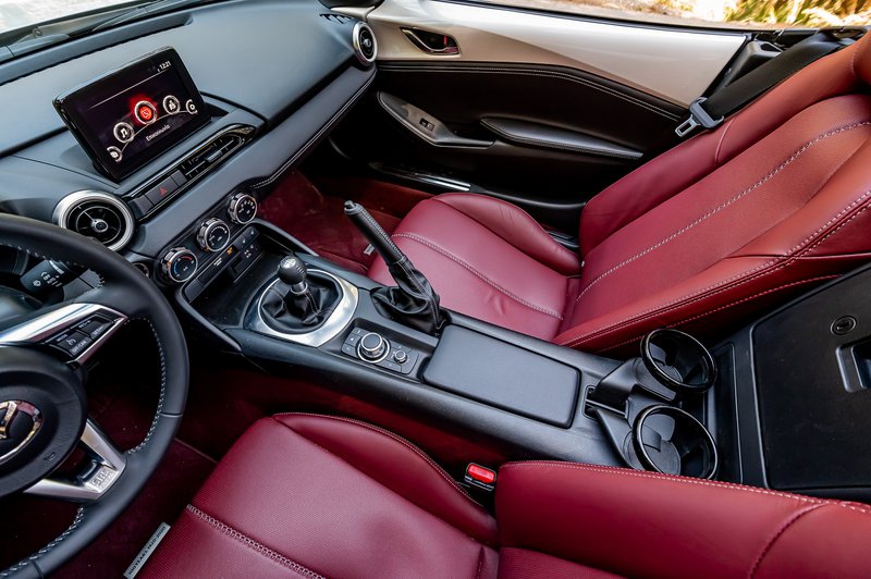 Είναι αυτές ενός γνήσιου roadster ή γκαρσονιέρας στο Τόκυο, και του… συγχωρείς τα πάντα. Ότι, δηλαδή, οι ποτηροθήκες είναι πίσω σου, το ντουλαπάκι του συνοδηγού είναι πίσω σου και το κινητό σου πρέπει να μείνει στην τσέπη σου. Το χειρόφρενο είναι τέρμα δεξιά προς τον συνοδηγό, αλλά όλα τα υπόλοιπα είναι εκεί που πρέπει. Το τιμόνι με σωστή διάμετρο, η θέση οδήγησης σπορ χωρίς να σε πνίγουν τα καθίσματα, κύριο όργανο το στροφόμετρο με όριο στις 8.000 rpm, και Ο επιλογέας, που θυμίζει με το σφαιρικό του μπουτόν παλιές, καλές εποχές.