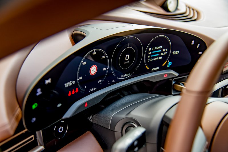 Ένα αναλογικό ρολόι στο άνω μέρος του ταμπλώ, μέρος του τυπικού για Porsche, Sport Chrono υποδηλώνει την ένδοξη ιστορία της Porsche στην αναμέτρηση, διαχρονικά, με τα χρονόμετρα, ενώ ο digital πίνακας των οργάνων (16,8 ιντσών), συνδυαστικά με ακόμη τρεις οθόνες, όλες touch, ακόμα και εκείνη στην πλευρά του συνοδηγού, τη διαφορετικότητα της Taycan.