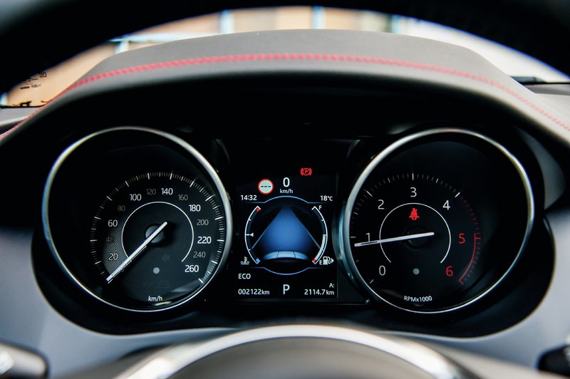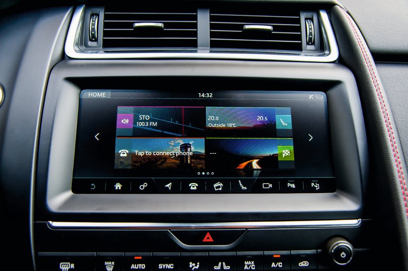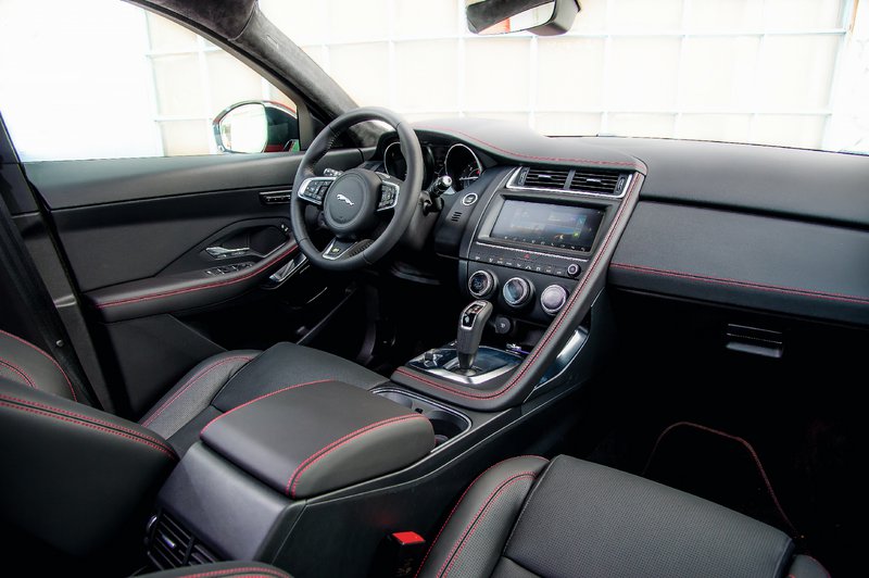 Αντίστοιχη είναι και η αίσθηση στο εσωτερικό, με δάνεια από την σπορ θεογονία της F-Type (και όχι το τυπικό «κάπου σε ξέρω» των Γερμανών), με πολύ καλή θέση οδήγησης (αν και ψηλά τοποθετημένη για Jag), και πολύ πλούσιο εξοπλισμό στην πανάκριβη έκδοση R-Dynamic «First Edition» της δοκιμής μας. Αν για κάτι θα πρέπει να γκρινιάξουμε είναι για την εικόνα κάποιων πλαστικών στην κονσόλα και στο κάτω μέρος του ταμπλό, καθώς και για την ανάγκη να χρησιμοποιεί κανείς διαρκώς το σύστημα infotainment «Τouch Pro» (το οποίο πάντως είναι ιδιαίτερα πλούσιο σε δυνατότητες και πολύ όμορφα γραφικά). Oι χώροι για τους πίσω επιβάτες είναι επαρκέστατοι (και πάντως μεγαλύτεροι απ' ότι αφήνει η σχεδίαση να φανταστείς) ενώ το πορτμπαγκάζ με τα 577 λίτρα, χάνει λίγο από την πολύ επικλινή πέμπτη πόρτα.