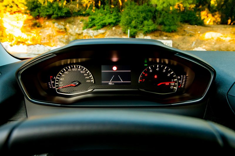 Αντ’ αυτού είδαμε τον παλιό, στενό αναλογικό πίνακα οργάνων με την ιδιότυπη φορά του στροφόμετρου, όπως το γνωρίζουμε από το παλιό 2008, και με τη δυσκολία στο να δεις πίσω από το τιμόνι (συμβουλή μας: καταργήστε τον αναλογικό πίνακα. Είναι σαν να ακούμε Deutsche Welle από το λαμπάτο ραδιόφωνο του παππού, στο smart home μας). Τουλάχιστον, η κεντρική οθόνη αφής 7 ιντσών είναι εκεί με το ελληνικό του μενού, με το οποίο σιγά σιγά εξοικειωνόμαστε, όπως εκεί είναι και τα γνωστά γαλλικά μοτίβα στη σχεδίαση και στα υλικά ή οι διακόπτες σαν πλήκτρα πιάνου, με άλλα λόγια ένα αρχοντικό, καλλίγραμμο ταμπλώ που απέχει από τα γερμανικά ταμπλώ όσο το Παρίσι από το Βερολίνο.