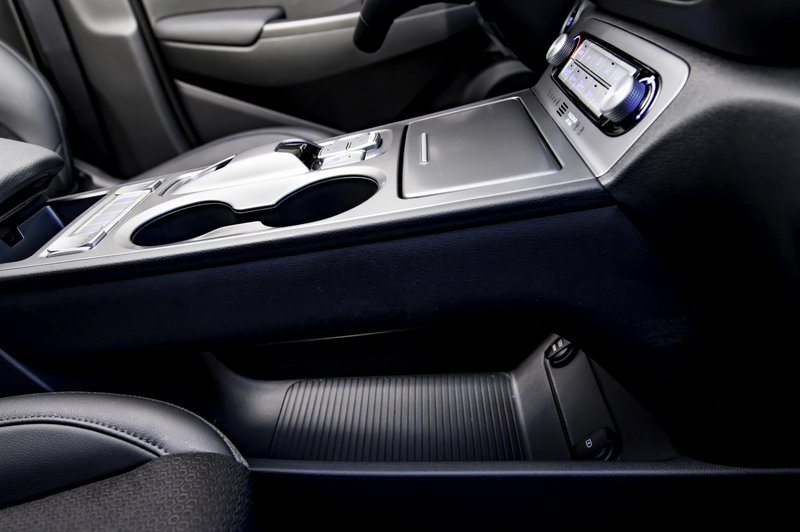 Στο εσωτερικό, η απαστράπτουσα, βαμμένη σε χρώμα ασημί κεντρική κονσόλα (που θα τη θέλαμε άβαφη) και η έλλειψη επιλογέα ταχυτήτων είναι αυτά που συγκρατείς. Εδώ τέσσερα κουμπιά (P, N, D και R) αναλαμβάνουν τη μετάδοση κίνησης στους εμπρός τροχούς και μαζί θα βρεις κανείς το drive mode για τα προγράμματα κίνησης μεταξύ Eco , Eco, Normal και Sport και -παραδοσιακά- χώρους για μικροαντικείμενα, οι οποίοι, μάλιστα, διαρθρώνονται σε δύο επίπεδα, καθώς ο drive-by-wire επιλογέας αφήνει χώρο και κάτω από την επιφάνεια με τους διακόπτες.