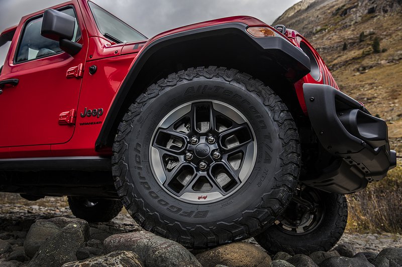 Για το Wrangler Rubicon, αυτή η αύξηση (από τα 25 στα 28 περίπου cm) προέκυψε κατά κύριο λόγο από την τοποθέτηση μεγαλύτερων ελαστικών. Το JL Rubicon φέρει ελαστικά διαστάσεων 285/70R-17, που είναι πιο γνωστά στους φίλους των off road αυτοκινήτων από την εξωτερική διάμετρό τους, αφού φτάνει τις 33 ίντσες! Το JK Rubicon «φορούσε» ελαστικά 32 ιντσών. Προκειμένου να είναι ικανό σε όλων των ειδών τις εκτός δρόμου επιφάνειες, το Rubicon εφοδιάζεται πλέον με ελαστικά BF Goodrich All-Terrain T/A KO2, τα οποία συναντήσαμε ξανά στο Ford Raptor. Όπου ίσως υστερούν αυτά στη λάσπη σε σύγκριση με τα Mud-Terrain T/A KM του παλιού Rubicon, υπάρχει η αντιστάθμιση της καλής ποιότητας κύλισης στη στεγνή (ή και τη βρεγμένη) άσφαλτο, αλλά και το καλό επίπεδο εκτός δρόμου πρόσφυσης. Εξάλλου, η Jeep λαμβάνει υπόψιν όσους στρέφουν συχνά το τιμόνι του αυτοκινήτου τους σε ιδιαίτερες επιφάνειες, προχωρώντας στην αλλαγή των ελαστικών πρώτης τοποθέτησης με κάποια άλλα, κατά πολύ πιο εξειδικευμένα.