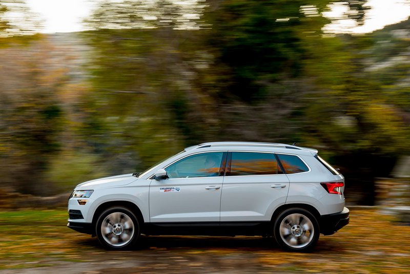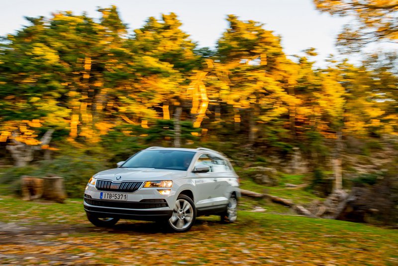 Το Karoq 1.0 TSI κάνει χρήση ενός πολύ καλού και αποδοτικού τρικύλινδρου turbo μοτέρ στα 999 cc με 116 ίππους και -αυτό είναι το καλό- 200 Nm ροπής. Τα γνωρίσματα του κινητήρα είναι εμφανή εδώ σε ένα αυτοκίνητο 1.340 κιλών. Τίμιες επιταχύνσεις από στάση, αλλά ρεπρίζ που ξεπερνούν οποιοδήποτε ατμοσφαιρικό 1600άρι. Έτσι το Karoq δείχνει ότι έχει αποθέματα ισχύος για ένα βαθύ πάτημα του γκαζιού και μια γρήγορη προσπέραση με μια σχέση επάνω, ξεχασμένη. Αισθάνεται καλά από τις 2.500 rpm επιταχύνοντας και αποδίδοντας μέχρι τις 6.000 rpm, χωρίς μάλιστα να ακούγεται η τρικύλινδρη φύση του. Θετικότατος ο επιλογέας στις αλλαγές, όσο σφικτός χρειάζεται, το δε τιμόνι είναι απρόσμενα -λόγω κατηγορίας- ακριβές και αρκετά άμεσο. Στις στροφές παρά τις κάποιες κλίσεις κρατάει καλά. Οι μεγάλες διαδρομές της ανάρτησης, και η απόσταση από το έδαφος στα 17,2 mm υπόσχονται μια κάποια «μικρή περιπέτεια» εκτός ασφάλτου, αλλά όχι και τόσο τα απολύτως ασφάλτινα ελαστικά Primacy3 της Michelin. Εδώ λοιπόν θα υποστρέψει, αλλά γρήγορα θα διορθωθεί η πορεία από το ESP. Επίσης εδώ θα θέλαμε ένα κάποιο είδος off-road παραμετροποίησης της μετάδοσης, κάτι που το έχουν λανσάρει εδώ και καιρό αρκετοί κατασκευαστές. Οι αναρτήσεις ακολουθώντας τη λογική της περικοπής κόστους κατά τα ειωθότα του VW Group δεν περιλαμβάνουν πολλαπλούς συνδέσμους πίσω αλλά ημιάκαπτο άξονα ενώ εμπρός υπάρχουν -όπως πάντα- γόνατα ΜακΦέρσον. Η ρύθμισή τους με μαλακά ελατήρια και κάπως σκληρά αμορτισέρ ρέπει προς το άνετο με μόνο αρνητικό σημείο κάποιες αναπηδήσεις του πίσω μέρους σε «σαμαράκια» ή σε κάποια ξεχασμένη φυτευτή πέτρα σε χωμάτινη διαδρομή.