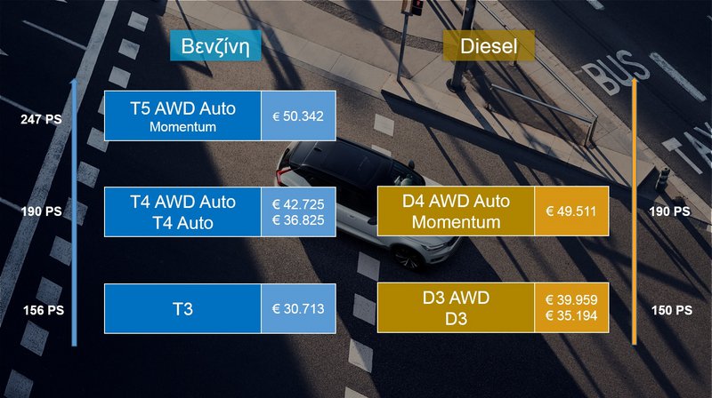 Οι τιμές των εισαγωγικών εκδόσεων T5 247 PS και D4 190PS είναι στα 50.342 και 49.511 ευρώ αντίστοιχα αν και το ίδιο εντυπωσιακό σκαρί έρχεται και με 1500άρη κινητήρα βενζίνης ισχύος 156 ίππων από τα 30.713 με μηχανικό κιβώτιο και κίνηση στους εμπρός τροχούς.