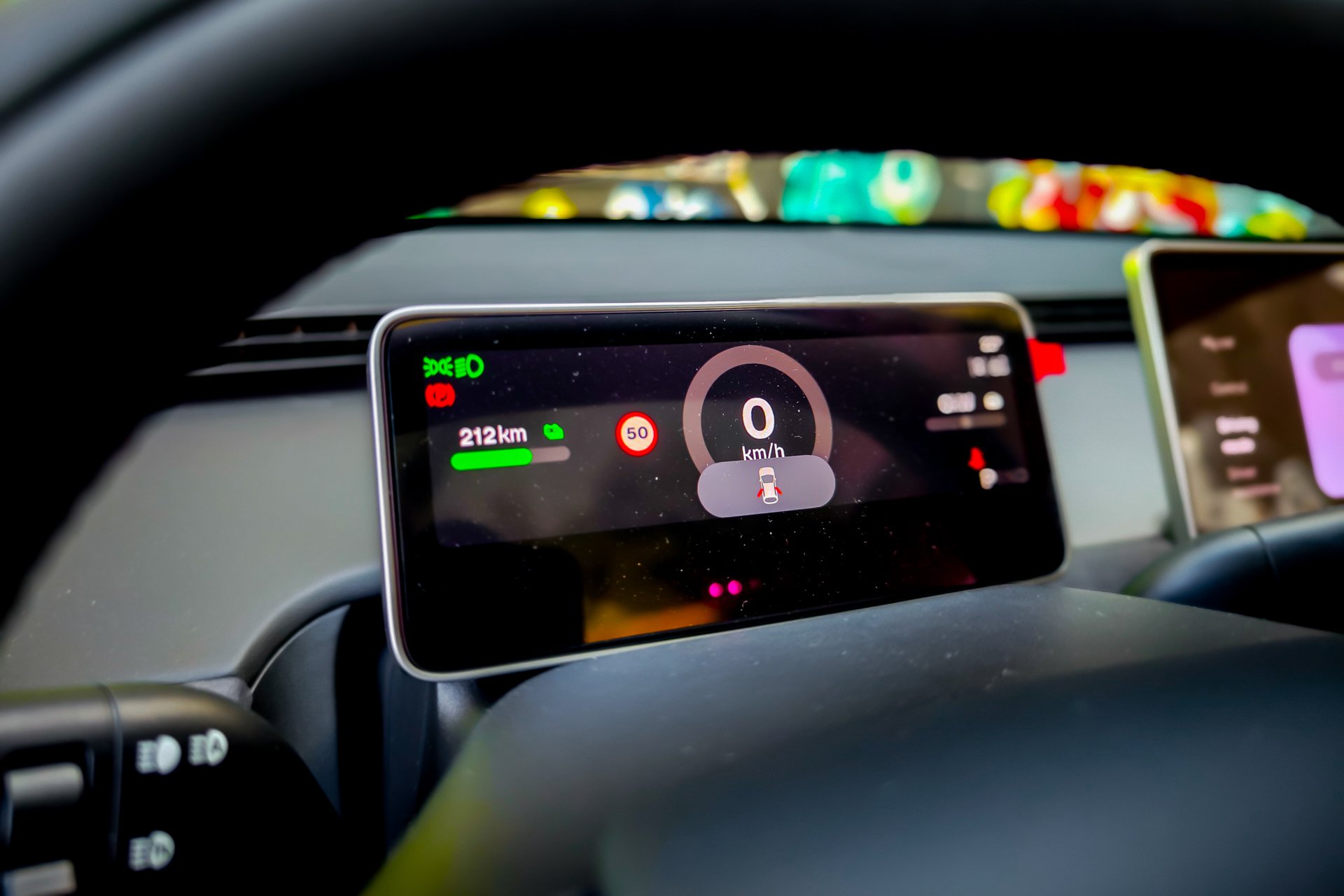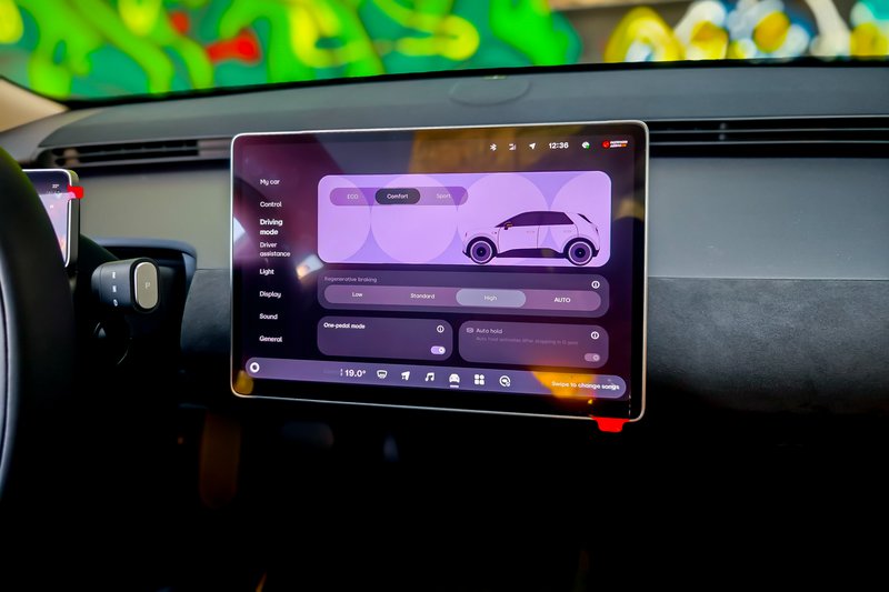 Στο εσωτερικό, η τεχνολογική εικόνα είναι σύγχρονη, μινιμαλιστική και εξόχως πρακτική, όπως διαπιστώσαμε τις ημέρες της δοκιμής μας. Η κεντρική οθόνη 13,2” με τα όμορφα γραφικά και ο ψηφιακός πίνακας οργάνων 6” είναι η γέφυρα επικοινωνίας και τα συστήματα βασίζονται στο λογισμικό Aster της Nio. Έτσι, το σύστημα πλοήγησης, λόγου χάριν, σου δίνει οδηγίες για το τι πρέπει να κάνεις οδηγικά και όχι απλά πλοήγηση. Επίσης μπορείς να απομονώσεις τις ηχητικές προειδοποιήσεις όσων ενοχλητικών ηχητικών σημάτων έχει φέρει το πρωτόκολλο ασφαλείας GSR2 με το πάτημα ενός κουμπιού (πολύ χρήσιμο αν σας ενοχλούν τα συνεχή «ντλίκιντι ντλόνγκ» από τη σουίτα ADAS. Το ταμπλό είναι χαμηλά τοποθετημένο με αποτέλεσμα να δημιουργείται ο απαραίτητος «αέρας» στο επάνω μέρος του που επιτρέπει στους αεραγωγούς του εξαερισμού να βρίσκονται εκεί, πέρα, μακριά στο παρμπρίζ. Το τιμόνι είναι flat top και bottom με αρκετές λειτουργίες να επιτελούνται από διακόπτες επάνω του.