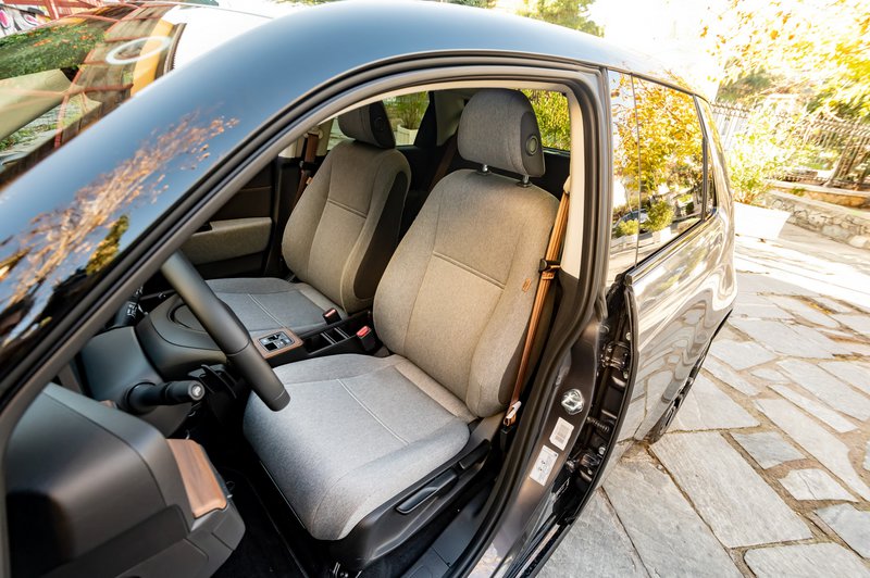 Εντός, θα θέλαμε αρχικά να μιλήσουμε για την εξαιρετική δουλειά που έχουν κάνει οι Ιάπωνες στον σχεδιασμό και για τον αρμονικό συνδυασμό ξύλου με ύφασμα και με ποιοτικά πλαστικά. Ας μη γελιόμαστε, πάντως. Ο… ελέφαντας μέσα στο δωμάτιο δεν είναι άλλος από τη σειρά οθονών που καλύπτει από άκρη σε άκρη το ταμπλώ. Μία προσέγγιση που απαντάμε για πρώτη φορά - και μάλιστα όχι σε κάποιο μεγάλο αυτοκίνητο πολυτελείας, αλλά σε ένα μικρό όχημα πόλης.