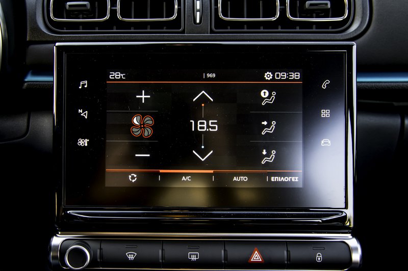 Στο κέντρο όλων παραμένει η έγχρωμη οθόνη αφής των 7 ιντσών, με την οποία μπορεί κανείς να ρυθμίσει το ηχοσύστημα, τον κλιματισμό, να συνδέσει το κινητό του για να περάσει δεδομένα του συστήματος πλοήγησης και τόσα άλλα. Η αισθητική της είναι καλή, η χρηστικότητά της, ωστόσο, πάσχει ελαφρά, καθώς η έλλειψη φυσικών διακοπτών για ορισμένες από τις βασικές λειτουργίες, όπως η χρήση του κλιματισμού, αναγκάζει τον οδηγό να πάρει τα μάτια του από τον δρόμο για περισσότερη ώρα από όσο θα έπρεπε. Ένα μικρό παράπονο διατηρούμε και για τις εσωτερικές θέσεις για μικροαντικείμενα, που δεν είναι ούτε ιδιαίτερα πρακτικές ούτε μεγάλες. Και κάπου εδώ τελειώνουν τα όσα μεμπτά μπορεί κανείς να απαριθμήσει για το εσωτερικό του C3.