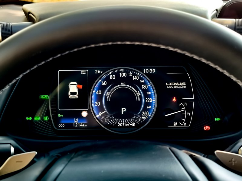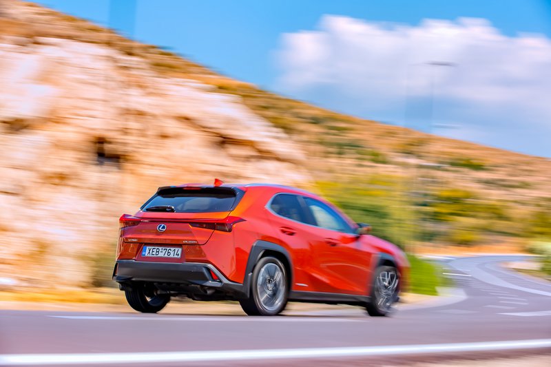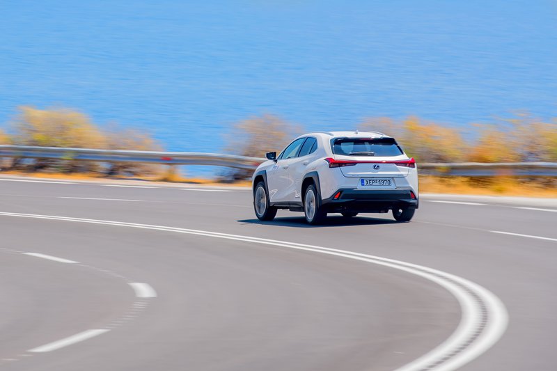 Η κίνηση παραμετροποιείται με προγράμματα Sport, Normal και Eco, με την τελευταία να είναι η κυρίαρχη επιλογή μας (ηλεκτρικό γαρ!).Περνώντας από λακκούβες, η αίσθηση στο UX 300h είναι κάτι παραπάνω από λιμουζινάτη, μιας και η προστασία των μπαταριών έχει δημιουργήσει ένα άκαμπτο πάτωμα που προσφέρει ανάλογα στην ακαμψία και στην οδηγική ακρίβεια. Ο ήχος της επιτάχυνσης στο Sport πρόγραμμα είναι… χωρίς υπερβολή μελλοντολογικός θυμίζοντας κάτι από Taycan (ως άκουσμα!). Ένα δύο χαρακτηριστικά παράδοξα. Ακόμα και επιλέγοντας τη θέση «B» στον μίνι επιλογέα, ή επιλέγοντας ισχύ πέδησης από δύο βαθμίδες από τα paddles στο τιμόνι, η πέδηση δεν είναι αρκετά ισχυρή και έτσι η οδήγηση με ένα πεντάλ δεν είναι εφικτή.