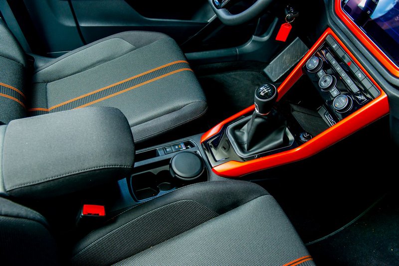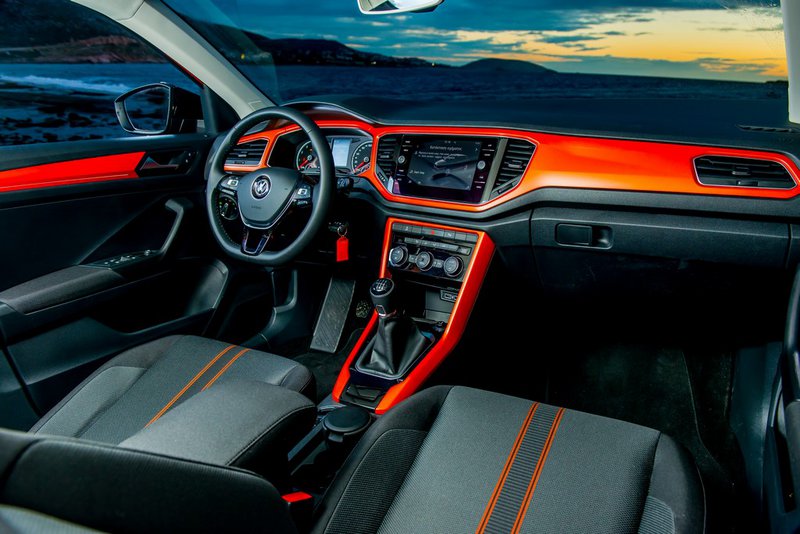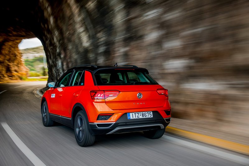 Στο εσωτερικό στεκόμαστε στην άριστη θέση οδήγησης (ίσως η καλύτερη στην κατηγορία) με σωστά τοποθετημένα όργανα, πολύ καλά καθίσματα και εξαιρετική περιμετρική ορατότητα. Το αυτοκίνητο όμως εδώ πηγαίνει εμπρός δια της...οπισθοδρομήσεως. Εξηγούμαστε. Το εσωτερικό επιφυλάσσει εκπλήξεις αν προτιμηθεί στις εκδόσεις με διχρωμία όπως το δικό μας 1000άρι με αυτό το πορτοκαλί χρώμα. Εδώ υπάρχουν πολλά νέα στοιχεία για την Volkswagen και μια ειλικρινής παραδοχή. Τα σκληρά πλαστικά που βασιλεύουν παντού στο εσωτερικό του T-Roc είναι σκληρά (σα...βράχος) και μας θυμίζουν αυτοκίνητα του ομίλου προ...20ετίας. Συνειδητά όμως έχουν τοποθετηθεί εκεί -σύμφωνα με τους ανθρώπους της φίρμας- για να μην πλησιάσει τα standards των Golf και Tiguan αλλά κι επειδή είναι το αυτοκίνητο πιο extreme. Ίσως δε να αποτελεί και ένα εφαλτήριο για προσέλκυση ενός πιο δραστήριου, νεανικού κοινού που δεν το νοιάζει αν τα πλαστικά θα είναι μαλακά ή σκληρά. Ας αφήσουμε στην άκρη τα πλαστικά κι ας ασχοληθούμε με τσιπάκια. Η γνωστή αρθρωτή αρχιτεκτονική των νέων υποσυστημάτων όλων των μοντέλων του ομίλου VW είναι εδώ με τη νέα οθόνη των συστημάτων multimedia (κι εδώ έχουμε πλήρως ελληνικό μενού) αλλά θα πρέπει να φτάσετε στην κορυφή των συστημάτων για να αποκτήσετε πλοήγηση. Ο πίνακας οργάνων είναι ο συμβατικός αλλά μπορεί -αναλόγως εξοπλιστικής έκδοσης- να ενσωματώσει Active Info Display, την 11,7 ιντσών οθόνη που αντικαθιστά τον παραδοσιακό πίνακα οργάνων. Προσφέροντας απλόχερα τη νέα τεχνολογία, η Volkswagen διαθέτει το T-Roc με στάνταρ από τη βασική έκδοση Front Assist με City Emergency Braking (πέδηση έκτακτης ανάγκης), Pedestrian Monitoring (παρακολούθηση κίνησης πεζών), Ενεργό σύστημα διατήρησης πορείας (Lane Assist) που λειτουργεί γρήγορα και πάντα αρκεί να υπάρχει υποτυπώδης διαγράμμιση, Multi Collision Braking (αυτόματη πέδηση μετά από σύγκρουση), Pre-Crash - Σύστημα προληπτικής προστασίας επιβατών αλλά και Fatigue Detection - Σύστημα αναγνώρισης κόπωσης οδηγού. Σίγουρα ένα μέγάλο «μπράβο» γι αυτή την τόσο σημαντική προσθήκη.