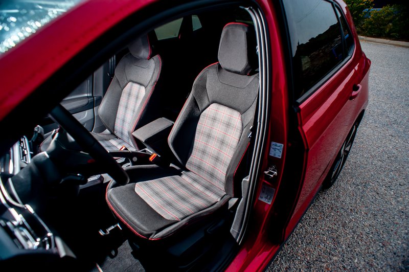 Σε λίγα αυτοκίνητα πηγαίνει το κόκκινο χρώμα και μέσα σε αυτά συγκαταλέγονται τα GTI της VW. Δυναμικό, χωρίς να γίνεται κραυγαλέο, σε υποψιάζει με τον τρόπο του για τα κρυφά του χαρίσματα. Σε σύγκριση με τις απλές εκδόσεις είναι 15 mm χαμηλότερο, ενώ οι τροχοί είναι στάνταρ 17 ‘’ και προαιρετικά διατίθενται και 18‘’, αν και δεν θα το προτείναμε για τους ελληνικούς δρόμους. Στις διαφορές προσθέστε νέους προφυλακτήρες, πλαϊνά μαρσπιέ, διπλή απόληξη για την εξάτμιση, spoiler οροφής, εμπρός πίσω λογότυπα GTI και για το τέλος αφήσαμε τα φωτιστικά σώματα. Στον στάνταρ εξοπλισμό ανήκουν τα ΙQ.Light LED που πέρα από την αισθητική αναβάθμιση προσφέρουν εξαιρετικό φωτισμό τη νύχτα, σε επίπεδα που θυμίζουν μοντέλο πολλαπλάσιας αξίας.