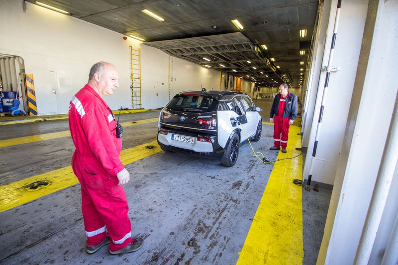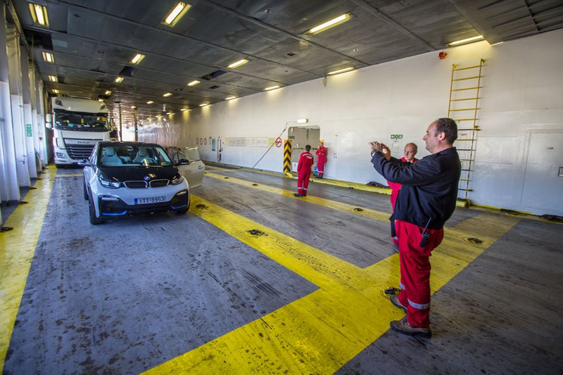 Στο ταξίδι μας προς την Ιταλία ζητήσαμε από την Superfast να μας επιτρέψει να φορτίσουμε στο πλοίο. Οι άνθρωποι της εταιρίας δέχθηκαν με μεγάλη χαρά, και μας εξυπηρέτησαν και με το παραπάνω. Η φόρτιση έγινε από την κλασική μπαταρία σούκο, με «οικιακό» ηλεκτρικό ρεύμα. Οι 22 ώρες που διαρκεί το ταξίδι ήταν υπεραρκετές για την πλήρη φόρτιση του i3 REX. Όσοι πάντως θέλουν να έχουν μία αντίστοιχη παροχή είτε προς την Ιταλία είτε στα μεγάλα εγχώρια ακτοπλοϊκά ταξίδια (βλέπε Κρήτη) καλό θα ήταν να επικοινωνήσουν από πριν με την εταιρία ώστε να τους εξασφαλίσει θέση δίπλα σε κάποια πρίζα.