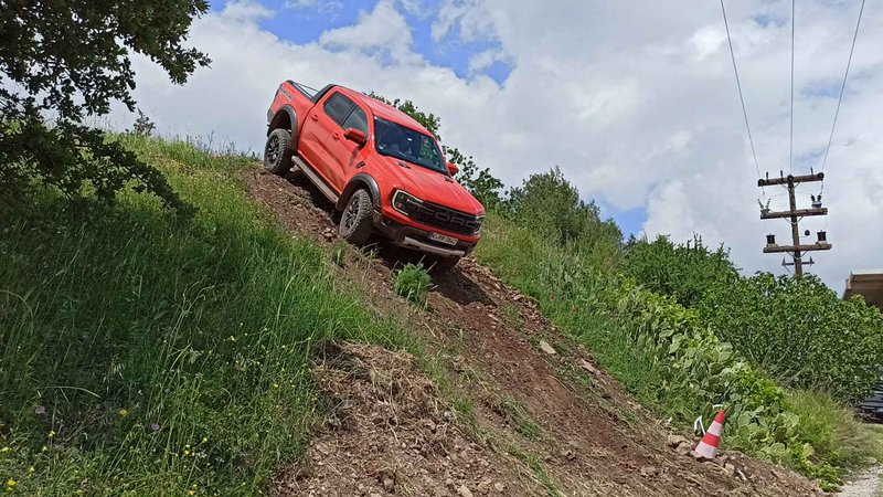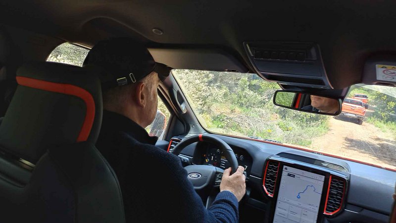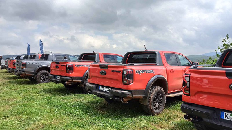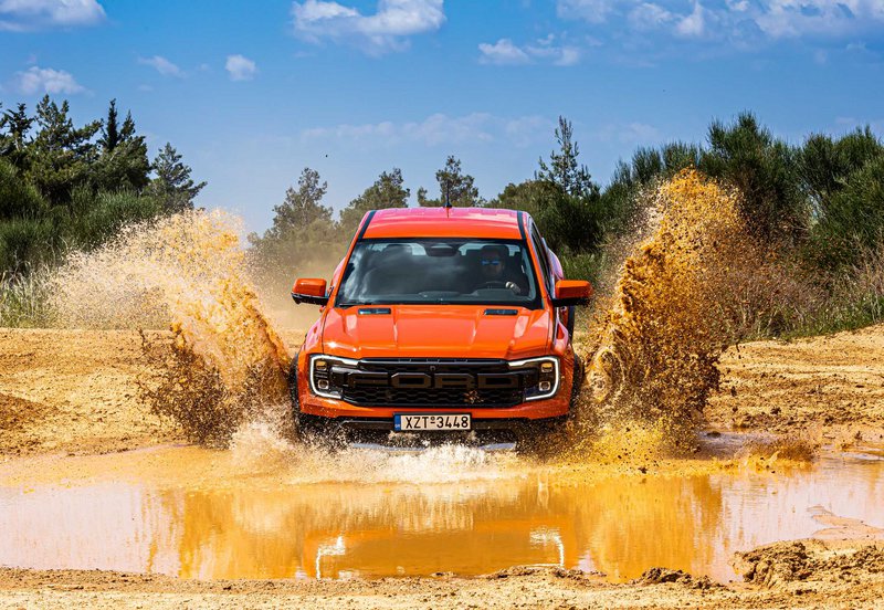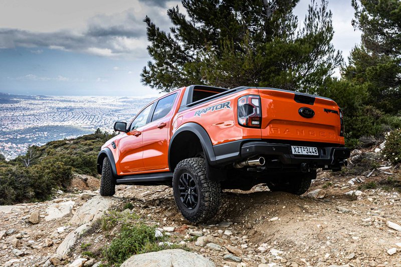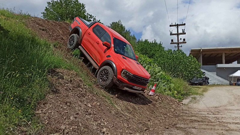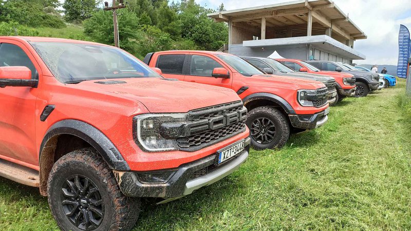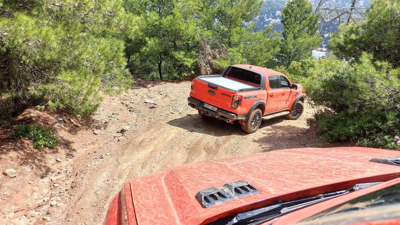 Είχαμε 8 διαθέσιμα Raptor για να ανακαλύψουμε εντός και εκτός δρόμου προς Πεντέλη με ειδικές διαδρομές σε χώμα. Μέχρι εκεί, το αυτοκίνητο είναι ένα υποβλητικό στριτάδικο pick up που με τις σπορ ρυθμίσεις κάνει πολλά πράγματα καλά και μόνο ο όγκος και το μήκος του σε ζορίζει εκεί που στενεύουν οι δρόμοι. Το δε δεκάρι κιβώτιο δίνει 160 km/h με 2.800 rpm. Τέλος ασφάλτου και με το ειδικό πλήκτρο στην οθόνη για τις λειτουργίες off road, λειτουργία trail control για να επικεντρώνεται ο οδηγός μόνο στο ανάγλυφο που έχει εμπρός του.