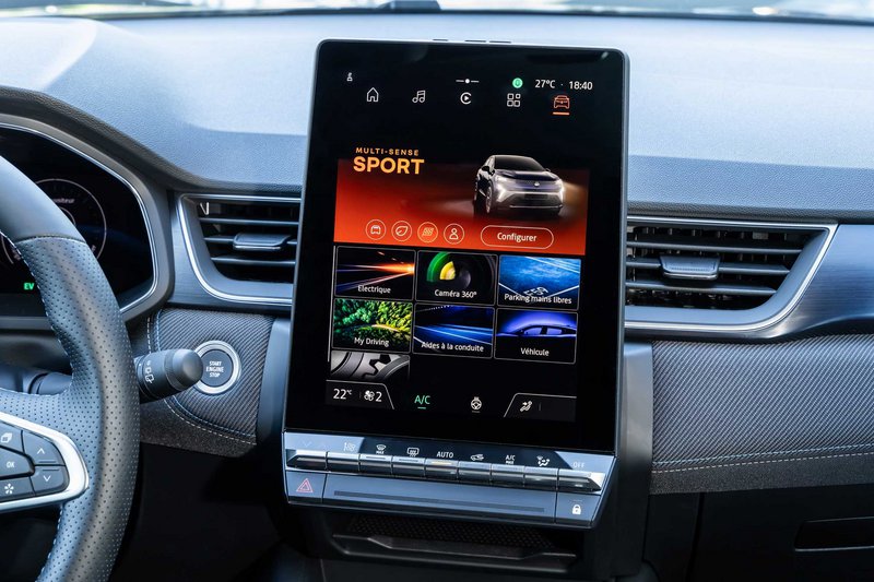 Περνώντας στο εσωτερικό, πέφτει αμέσως το βλέμμα στην κεντρική κονσόλα, η οποία έχει αλλάξει εντελώς. Η κάθετη οθόνη σχήματος τάμπλετ των 10,4” είναι γνωστή από διάφορα μοντέλα της Renault, χαμηλότερα υπάρχει ένα αιωρούμενο μπράτσο και κάτω από αυτό βρίσκεται η θέση ασύρματης φόρτισης του κινητού, όπως επίσης θήκες για μικροαντικείμενα και θυρίδες USB. Ειδική μνεία αξίζει στο προηγμένο σύστημα πολυμέσων OpenR Link με λογισμικό Αndroid Automotive 12, που αποδεικνύεται εξαιρετικά άμεσο και λειτουργικό και αποτελεί -σύμφωνα με τη Renault- το κορυφαίο Infotainment System της κατηγορίας. Για τον πίνακα οργάνων υπάρχουν δύο επιλογές, μια βασική με ψηφιακό display 7,0” και μια αναβαθμισμένη με οθόνη 10,0”.