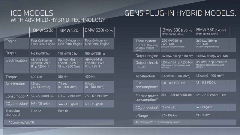 Η γκάμα της νέας σειράς 5 της BMW έχει και άλλα ενδιαφέροντα μέλη που συνθέτουν μια πληρέστατη ποικιλία επιλογών μεταξύ δύο βενζινοκίνητων (BMW 520i [208 hp] και 530i xDrive [269 hp]), δύο plug-in hybrid που θα λανσαριστούν την ερχόμενη άνοιξη (BMW 530e sDrive [299 hp] και BMW 550e xDrive [489 hp]), μιας πετρελαιοκίνητης και δύο πλήρως ηλεκτρικών εκδόσεων i5, με τη διαθέσιμη ισχύ να κυμαίνεται μεταξύ 208 και 601 ίππων. Όλες δε οι εκδόσεις με κινητήρα εσωτερικής καύσης είναι εξηλεκτρισμένες - 48V Mild Hybrid ή Plug in Hybrid.