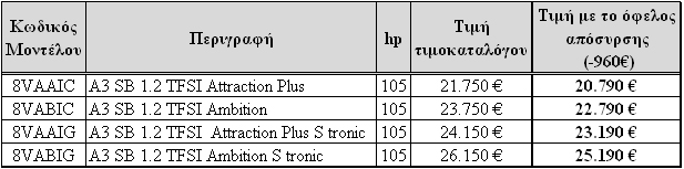 Με τιμή εκκίνησης τα 20.790€ με το όφελος της απόσυρσης, το νέο Audi A3 Sportback 1.2 TFSI αποτελεί τη πιο ελκυστική πρόταση της αγοράς καλύπτοντας τις ανάγκες της συγκεκριμένης κατηγορίας σε ακόμα πιο ελκυστική τιμή.