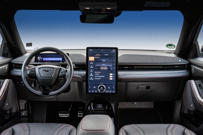 To εσωτερικό είναι όσο μίνιμαλ ήταν και στην πρώτη Mustang μόνο που τώρα το χρώμιο έχει δώσει τη θέση του στα pixel με γιγάντιες HD οθόνες (με την κεντρική να είναι αφής 15,5 ιντσών!) που αναλαμβάνουν το… πιλοτάρισμα του αυτοκινήτου (γίνεται και ημιαυτόνομη οδήγηση).