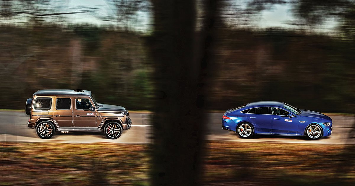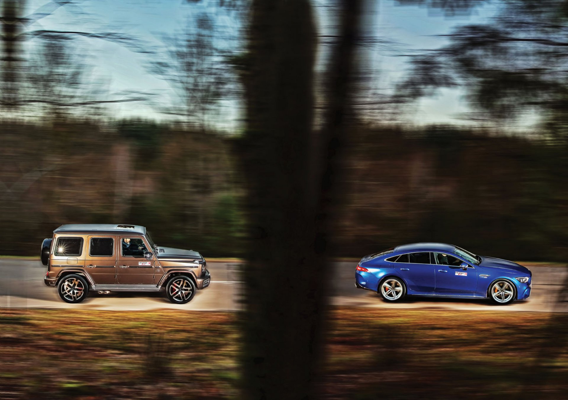 H GT 63S 4-Door Coupe των 639 ίππων και η G63 των 585 ίππων δεν είναι δύο ακόμα πολύ γρήγορα αυτοκίνητα. Είναι πρώτα απ' όλα η κορύφωση όλων όσων πρεσβεύει η AMG: Όλα στο maximum και τίποτα αφημένο στην τύχη. Οδηγήσαμε τα δύο κορυφαία από άποψη ιπποδύναμης τετράθυρά της, δυο αυτοκίνητα τόσο διαφορετικά όσο δεν γίνεται, αλλά και τόσο όμοια στον πυρήνα της ιδιοσυγκρασίας τους. Από τη μια η GT, η κατ' όνομα τετράθυρη έκδοση του εξαιρετικού coupe GT, η οποία κουβαλά μαζί της τον τίτλο του γρηγορότερου sedan στο Ring και το στέμμα της ισχυρότερης AMG μετά την one-off ΑΜG SL65 Βlack Edition με τον V12 και τους 670 ίππους.