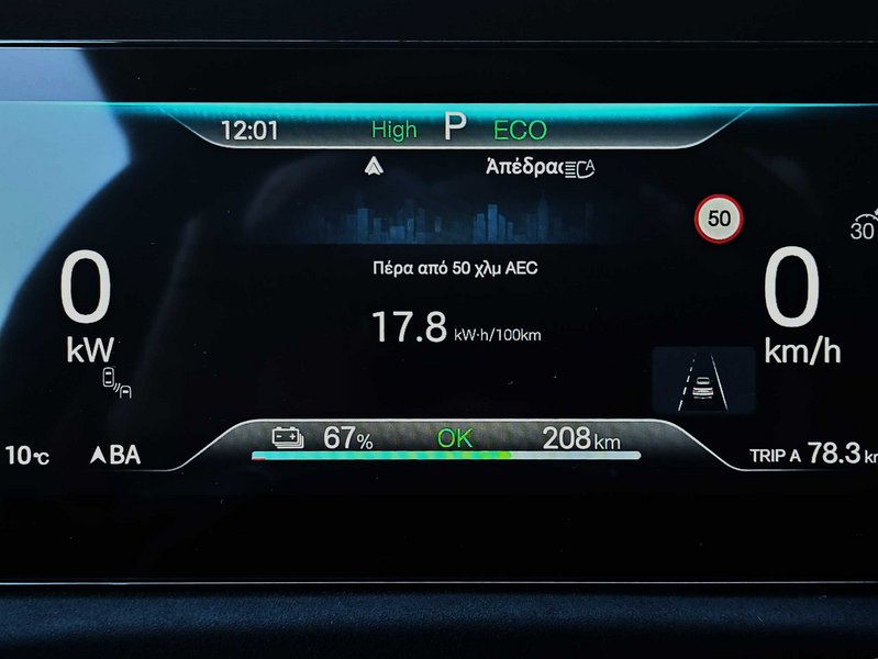 Και αν επιλέξετε το sport πρόγραμμα, θα πάρετε μια καλή γεύση από συγκινήσεις. Μια δυο φορές σε κυματισμούς της ασφάλτου το αυτοκίνητο έδειξε ένα κλικ πιο τεμπέλικο ριμπάουντ στον πίσω άξονα, αλλά όχι κάτι κακό. Κι από την άλλη, όντως η ποιότητα κύλισης είναι θαυμάσια. Όμως, να, όντως η μπαταρία θα έπρεπε να είναι μεγαλύτερης ενεργειακής χωρητικότητας για να νιώσετε ότι μπορείτε να πάτε πραγματικά παραπέρα. Αλλά πάλι, θα είχαμε μεγαλύτερο βάρος, οπότε… φαύλος κύκλος! Και κάτι ακόμα: Υπάρχει μόνο αυτόματη αναγεννητική πέδηση χωρίς σύστημα one-pedal braking, οπότε και δεν υπάρχει έστω μία αίσθηση αυξημένης συμμετοχής στην αναγεννητική πέδηση. Τουλάχιστον, η αστική κίνηση όντως αποδίδει θαυμάσια, «αυγαταίνοντας» τα χιλιόμετρα αυτονομίας.