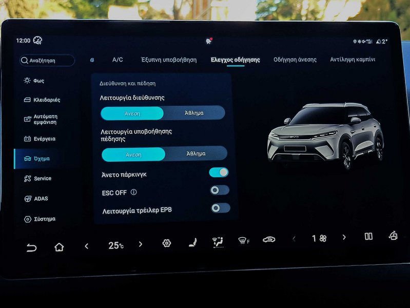 Μπαίνοντας στο Atto 2, συναντάς ένα cockpit με καθαρές γεωμετρικές φόρμες, μαλακά και ωραία στην υφή υλικά και λεπτομέρειες που δίνουν μια εύπεπτη αισθητική και, μάλιστα, χωρίς φαντεζί ευρήματα τύπου… Atto 3. Η κονσόλα διαθέτει αποθηκευτικούς χώρους, ποτηροθήκες και έναν επιλογέα σε στυλ διαμαντιού που θυμίζει έντονα… Volvo. Φυσικοί διακόπτες, όμως, για βασικές λειτουργίες υπάρχουν και προσφέρουν ευκολία, ενώ δεν λείπουν από την εξίσωση τα driving modes Eco, Normal, Sport και Snow που προσαρμόζουν παραμέτρους απόδοσης ανάλογα με τις συνθήκες ή τη διάθεση. Ο πίνακας οργάνων είναι 8,8”, το infotainment παίζει «μπάλα» σε υψηλό επίπεδο με εξαιρετικά παραμετροποιήσιμο λειτουργικό και σε ελληνικό περιβάλλον, με την κλασικά για BYD περιστρεφόμενη οθόνη 10,1” ή 12,8”, υποστήριξη Android Auto και Apple CarPlay, καθώς και λειτουργίες αναβαθμίσεων Over-the-Air. Οι επιβάτες έχουν ποικίλες δυνατότητες φόρτισης των συσκευών τους, με θύρες USB Type C 60W και Type A 7,5W μπροστά και δύο ακόμα θύρες USB στο πίσω μέρος. Το δε ηχοσύστημα υποστηρίζει Spotify, YouTube και Zoom. Και, βέβαια, υπάρχει και φωνητική βοηθός που με ένα μας πρόσταγμα μπορεί να εκτελέσει μια πλειάδα λειτουργιών του αυτοκινήτου και να βοηθήσει με δυνατότητες multitasking. Αφήστε που μέχρι και καραόκε υποστηρίζει το αυτοκίνητο, όπως το είδαμε… live. Τέλος, με πλήρως επίπεδο πάτωμα, κορυφαίο χώρο για τους πίσω επιβάτες, 400 L χώρου αποσκευών και δυνατότητα επέκτασης στα 1.340 L με την αναδίπλωση των πίσω καθισμάτων, το Atto 2 δεν κάνει εκπτώσεις ούτε στη μεταφορική πρακτικότητα.