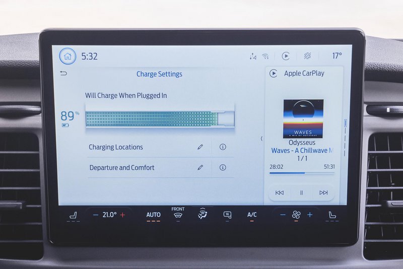 Παράλληλα, το νέο E-Transit εισάγει και το σύστημα infotainment SYNC 4 με την οθόνη αφής των 12 ιντσών στη γκάμα των επαγγελματικών οχημάτων της Ford στην Ευρώπη, προσφέροντας διπλάσια υπολογιστική ισχύ από το προηγούμενο SYNC 3.