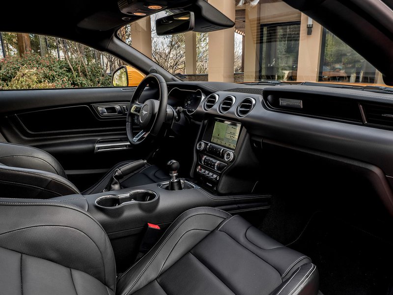 Στο εσωτερικό έχει γίνει μια σοβαρή προσπάθεια να βελτιωθεί ακόμα περισσότερο η ποιότητα των υλικών και η εργονομία, ενώ έχουν προστεθεί πολλά νέα στοιχεία που προσθέτουν ακόμα περισσότερο χαρακτήρα στο αυτοκίνητο. Το δέρμα κυριαρχεί σε όλο το σαλόνι, με τα φιλέτα αλουμινίου σε επιλεγμένα σημεία να δίνουν τον σπορ τόνο στην όλη κατασκευή. Εντυπωσιακός είναι και ο ψηφιακός πίνακας οργάνων των 12 ιντσών, με άπειρες δυνατότητες εναλλακτικής διαμόρφωσης και μία πληθώρα πληροφοριών πιου μπορεί να παρέχει στον οδηγό (μπορεί να προβάλλει ακόμα και... animation με ειδικά γραφικά!). Και στο σαλόνι οι δυνατότητες να «ράψει» κάποιος την δική του Mustang στα δικά του μέτρα και την αισθητική του είναι πληθωρικές, με το πακέτο Carbon Sport να δημιουργεί ένα πιο «ψαγμένο» σαλόνι με δέρματα Αλκαντάρα, επενδύσεις από ανθρακονήματα σε αρκετά σημεία του αυτοκινήτου και πολύ εξελιγμένα καθίσματα της Recaro (που και αυτά προσφέρονται σε τρεις διαφορετικές χρωματικές επιλογές, έτσι ώστε το... πάρτι του configuration να μην τελειώνει ποτέ...)