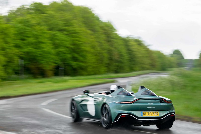 Αποφύγαμε επιτυχώς πολλές ξαφνικές μπόρες, όπως προς τα τελευταία περίπου δύο χιλιόμετρα του ταξιδιού μας, οπότε η V12 Speedster βρέθηκε στο επίκεντρο ενός αναπόφευκτου κατακλυσμού. Αν ήμαστε μέσα σε ένα roadster, δεν θα είχαμε βραχεί τόσο πολύ. Αυτή η Aston Martin επιβεβαίωσε ότι αυτό μπορεί να συμβεί μόνον εάν το παρμπρίζ υπάρχει στη θέση του. Ευτυχώς, το εσωτερικό της V12 Speedster έμεινε άθικτο από το μούλιασμα.
