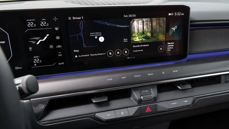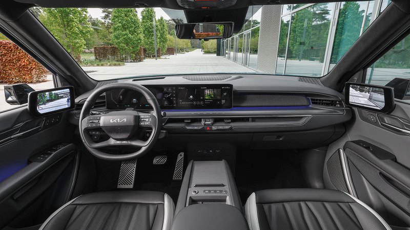 Φυσικά, το πιο εντυπωσιακό στοιχεία στο εσωτερικό είναι το ψηφιακό ταμπλό Panoramic Wide Display, που αποτελείται από έναν ψηφιακό πίνακα οργάνων 12,3 ιντσών, μια οθόνη ενημέρωσης και ψυχαγωγίας 12,3 ιντσών και ένα πάνελ κλιματισμού 5,3 ιντσών για πληροφορίες σχετικά με τα καθίσματα και τη θέρμανση. Οι πληροφόρηση του οδηγού μπορεί να υποστηριχθεί προαιρετικά και από Head-Up Display (HUD), ο οποίος έχει στη διάθεσή σου και επαρκείς φυσικούς διακόπτες στο τιμόνι και στην κεντρική κονσόλα. Όλες οι σύγχρονες τεχνολογίες συνδεσιμότητας προβλέπονται (Android Auto, Apple CarPlay), όπως και οι υπηρεσίες Kia Connect Live Services, οι οποίες περιλαμβάνουν online πλοήγηση καθώς και πληροφορίες σε πραγματικό χρόνο σχετικά με την κυκλοφορία, τη διαθεσιμότητα και το κόστος στάθμευσης, κ.α., όπως και το υψηλής πιστότητας ηχοσύστημα Meridian Premium Sound System με 14 ηχεία και με εξωτερικό ενισχυτή.