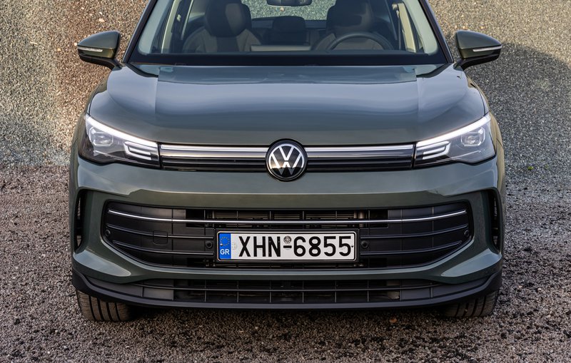 Το εμπρός μέρος ξεχωρίζει από τους νέους επίπεδους προβολείς LED IQ.LIGHT HD matrix και μια οριζόντια λωρίδα πίσω από μια γυάλινη επιφάνεια, παραπέμποντας ευθέως στο ID.4. Στις άκρες του προφυλακτήρα βρίσκονται οι αεραγωγοί, ενώ οι αεροκουρτίνες εξασφαλίζουν τη βέλτιστη ροή του αέρα. Ως αποτέλεσμα αυτή η σχεδιαστική νοοτροπία του Tiguan έχει μειώσει τον συντελεστή οπισθέλκουσας από 0,33 σε 0,28.