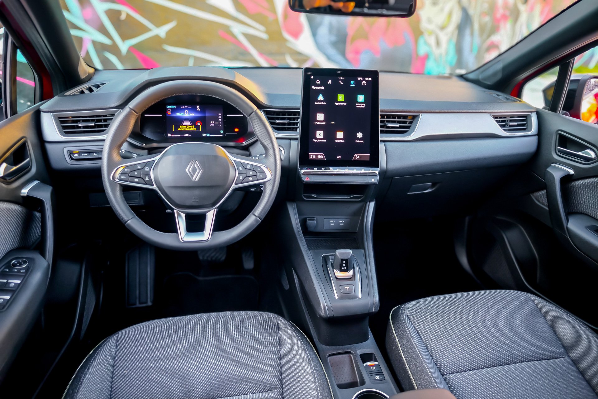 Η είσοδος στο εσωτερικό αποκαλύπτει μια ψηφιακή εικόνα που τη γνωρίζουμε ήδη και δεν περιορίζεται σε μια μεγάλη οθόνη, αλλά αλλάζει συνολικά τη φιλοσοφία χρήσης. Η κάθετα τοποθετημένη οθόνη αφής των 10,4” φιλοξενεί το σύστημα openR Link με ενσωματωμένες υπηρεσίες Google, δημιουργώντας ένα περιβάλλον που θυμίζει περισσότερο το smartphone ή το tablet μας παρά παραδοσιακό infotainment αυτοκινήτου. Η ποιότητα είναι τυπική γαλλική με ωραία μαλακά πλαστικά, οι χώροι πρακτικοί αν και θα μπορούσαν να είναι καλύτεροι αφού δε βρίσκουμε αιωρούμενη κονσόλα ο δε νέος «τόσο δα» επιλογέας e-shifter είναι εκεί αν και θα μπορούσε να έχει… μετακομίσει στην κολόνα. Από την άλλη τα πίσω καθίσματα κινούνται σε ράγες αυξομειώνοντας τον χώρο αποσκευών ή τον ούτως ή άλλως πολύ καλό χώρο πίσω επιβατών.