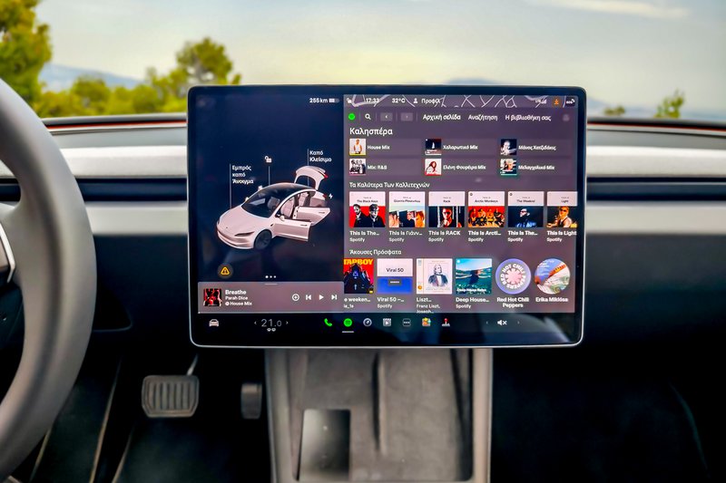 Και μιας και αναφερθήκαμε στην οθόνη, αυτή εξακολουθεί να είναι 15,4" με μεγαλύτερη όμως επιφάνεια να χρησιμοποιείται λόγω στενότερου πλαισίου ενώ ρυθμίζεις και το μέγεθος γραμματοσειρών έχοντα παράλληλα top δικτυακή σύνδεση (καλύτερη λήψη κινητής, Wi-Fi στα 2,4 και 5 GHz). Από εδώ επίσης μπορείτε να ελέγξετε videogames, διαδραστικές εφαρμογές και τα πολύ ψαρωτικά show με φως και ήχο (και άλλα πολλά, μοναδικά από την Tesla). Το μόνο «τρανταχό» μείον του εσωτερικού, είναι η έλλειψη κανονικής οροφής ή έστω ενός καλού σκιάδιου, καθόσον τις ημέρες δοκιμής μας με συνθήκες καύσωνα έπρεπε να οδηγούμε φορώντας καπέλο, μιας και η μεγάλη, γυάλινη οροφή απλά…ζεμάταγε!