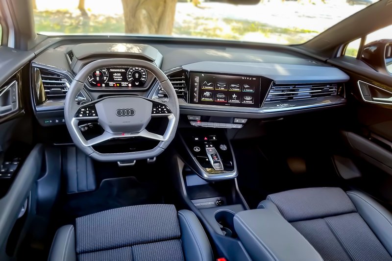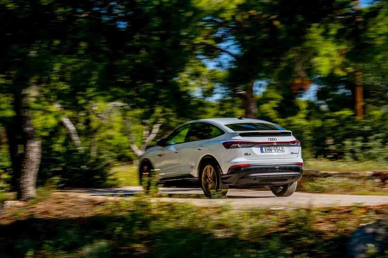 Η ποιότητα κύλισης είναι κορυφαία και το αμάξωμα με τον χαμηλό αεροδυναμικό συντελεστή (Cd 0,28) ανεπηρέαστο από τους πλευρικούς ανέμους. Η χαμηλωμένη κατά 15 mm ανάρτηση της έκδοσης S Line είναι σφικτή, χωρίς να κουράζει ιδιαίτερα τους επιβάτες και ανταπεξέρχεται με επιτυχία στη διαχείριση του υψηλού βάρους του αμαξώματος και της άφθονης ροπής των 545 Nm του ηλεκτροκινητήρα. Ακλόνητο σε όλες τις περιπτώσεις το πισωκίνητο Q4, με μια πληθώρα ηλεκτρονικών ADAS για τη δύσκολη στιγμή, ένα ηλεκτρικό SUV με το οποίο μπορείς να κινηθείς με άνεση στην πόλη, αλλά και να πραγματοποιήσεις υπό προϋποθέσεις και ένα μεγαλύτερο ταξίδι.