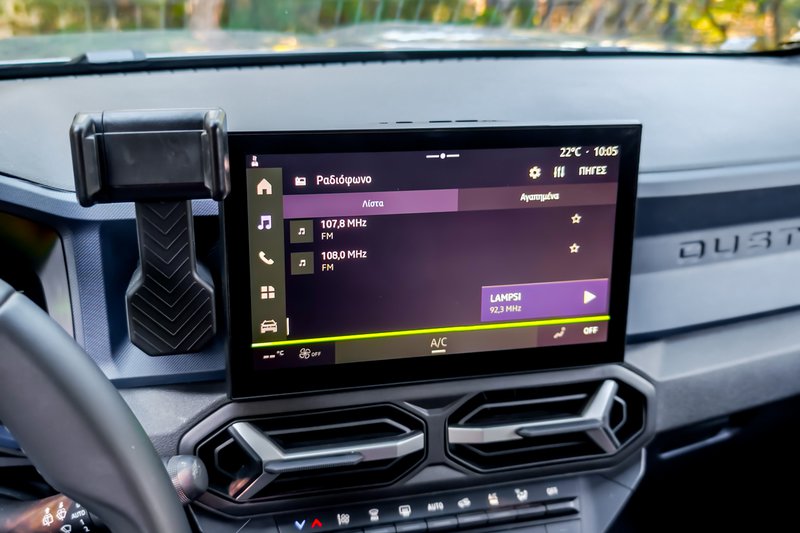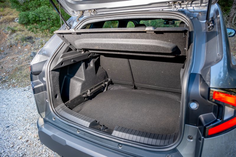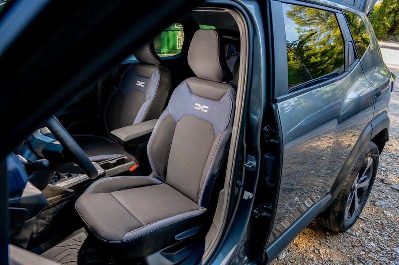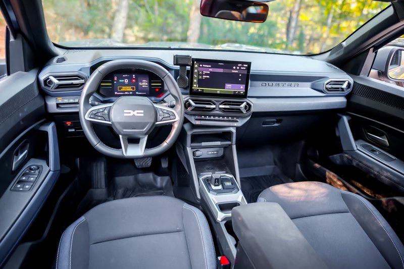 Η καμπίνα παραμένει, κι αυτή, πιστή στη φιλοσοφία της Dacia, αλλά με σαφή αναβάθμιση, ενώ ξεχωρίζει για τα όμορφα γεωμετρικά του σχήματα με ένα ρηχό, κάθετο ταμπλώ, μια οθόνη αφής 10,1΄΄ στραμμένη προς τον οδηγό και έναν μίνιμαλ ψηφιακό πίνακα οργάνων 7΄΄ να κυριαρχούν με ελληνικά μενού παντού, αλλά και μία κάποια μικρή γραμματοσειρά. Ο χώρος για τους επιβάτες και τις αποσκευές είναι στο πλαίσιο της κατηγορίας των C-SUV, ενώ το πορτμπαγκάζ φτάνει στα 517 L . Τα προαιρετικά λαστιχένια πατάκια με μορφολογικά μοτίβα, υπενθυμίζουν το σκληροτράχηλο της υλοποίησης, όμως εκείνο που σε κερδίζει είναι ότι έχει ε-ξαι-ρε-τι-κή πρακτικότητα. Από ειδική εσοχή για να έχεις όρθιο το κινητό σου στη βάση της κονσόλας (πώς και δεν το σκέφτηκε άλλος;), μέχρι τα YouClips, αναμονές στην καμπίνα για πρακτικά αξεσουάρ που μπορεί κανείς να προμηθευτεί αναλόγως αναγκών (για παράδειγμα: ποτηροθήκη με ενσωματωμένο φωτάκι για τους πίσω επιβάτες). Η ποιότητα είναι τυπική της Dacia, με καλή συναρμογή και πολύ σκληρά πλαστικά παντού, κάτι που μερικές φορές μπορεί να επιφέρει και κάποιους τριγμούς, όπως διαπιστώσαμε με το αυτοκίνητο δοκιμής μας.