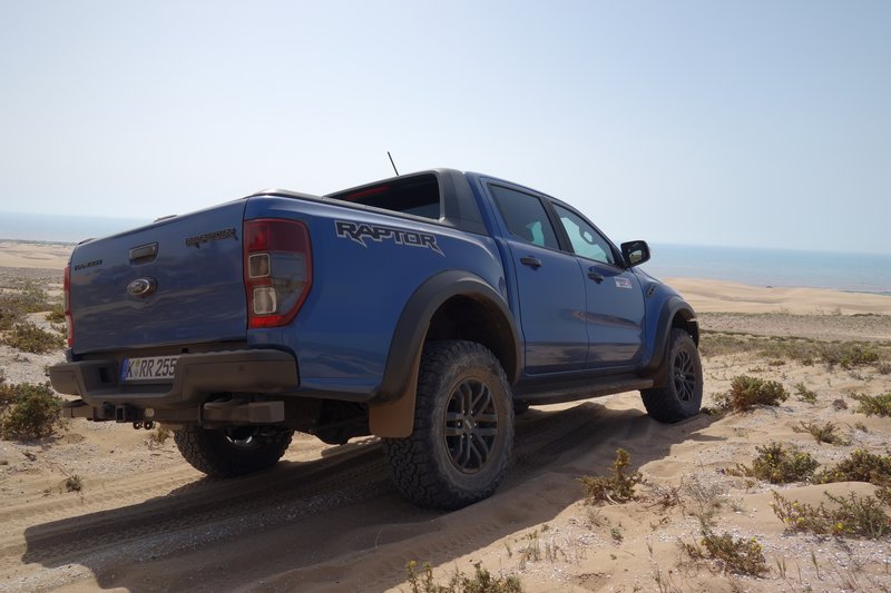 Το κοιτάζεις από μακριά στο πάρκινγκ του αεροδρομίου και αντιλαμβάνεσαι με την πρώτη ματιά ότι εδώ κάτι πολύ διαφορετικό συμβαίνει. Και από τα πρώτα χιλιόμετρα στους επαρχιακούς δρόμους του Μαρόκου ξέρεις ότι αυτό το αυτοκίνητο αλλάζει τον χάρτη της κατηγορίας μια για πάντα. Το κύριο στοιχείο που το ξεχωρίζει είναι το τετρακίνητο πακέτο, και δη οι αναρτήσεις. Ουσιαστικά μπορεί να περάσει από παντού, ακόμα και από σημεία που ερπυστριοφόρα της ΕΜΑΚ θα τα έβρισκαν σκούρα, με την απόσταση από το έδαφος και την κορυφαία λειτουργία των σκληροτράχηλων αμορτισέρ με τα μεγάλα περιθώρια ελευθερίας κίνησης των τροχών να ισοπεδώνουν οτιδήποτε βρεθεί στον διάβα τους. Η τετρακίνηση με τα πολλά προγράμματα λειτουργεί ιδανικά στην πράξη, καθώς καλύψαμε όλα τα σενάρια (πλην χιονιού, αυτό βρισκόταν ακόμα στην... Ελλάδα), με έμφαση κυρίως στα ανομολόγητα παιχνίδια στις τεράστιες αμμουδιές του Ατλαντικού. Εκεί κυριολεκτικά το Raptor «οργίασε», κάνοντας τα αδύνατα δυνατά ακόμα και σε σημεία που νόμιζες ότι η άμμος θα μπορούσε να σε καταπιεί μία για πάντα. Ένας ακόμα σημαντικός κρίκος ήταν και τα απίστευτα λάστιχα, στα οποία μπορείς να ακουμπήσεις χωρίς τον παραμικρό φόβο του κλαταρίσματος, αποδεικνύοντας για άλλη μια φορά πόσο σημαντικά είναι τα ελαστικά στις εκτός δρόμου αποδράσεις. Στην άσφαλτο το Raptor είναι ιδιαίτερα πολιτισμένο και άνετο, με την μεγάλη διαδρομή της ανάρτησης να μην επηρεάζει την ακρίβεια των χειρισμών και την ικανότητά του να στρίβει με ακρίβεια και χωρίς περιττά δράματα. Το τιμόνι είναι όσο βαρύ και με την απαραίτητη αίσθηση που περιμένεις από ένα τέτοιο αυτοκίνητο, ενώ και οι τέσσερις δίσκοι σταματούν τους 2,5 τόνους του αμαξώματος με σαφή αίσθηση και χωρίς να δείχνουν σημάδια κόπωσης. Ο κινητήρας προσπαθεί να σταθεί στο ύψος των περιστάσεων και του μεγάλου βάρους χωρίς να είναι πάντως το δυνατό χαρτί του αυτοκινήτου (έχει όμως ωραίο ήχο τύπου V8 από το σύστημα ενίσχυσης μέσω των ηχείων...). Το 10τάχυτο κιβώτιο έχει πολύ καλή συμπεριφορά και βοηθά τον κινητήρα να βρίσκεται στο ωφέλιμο εύρος της λειτουργίας του, ιδίως στην σπορ ρύθμιση, όπου κρατά τις σχέσεις λίγο παραπάνω και είναι πιο άμεσο στα κατεβάσματα πολλών σχέσεων μαζί.