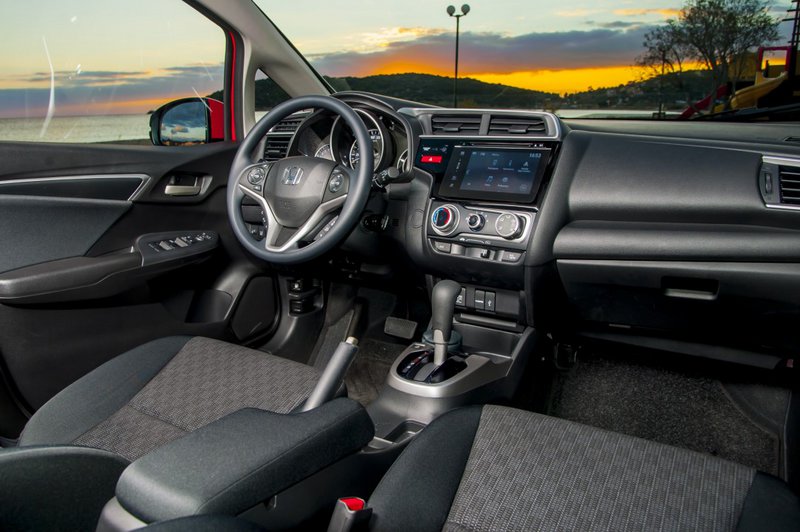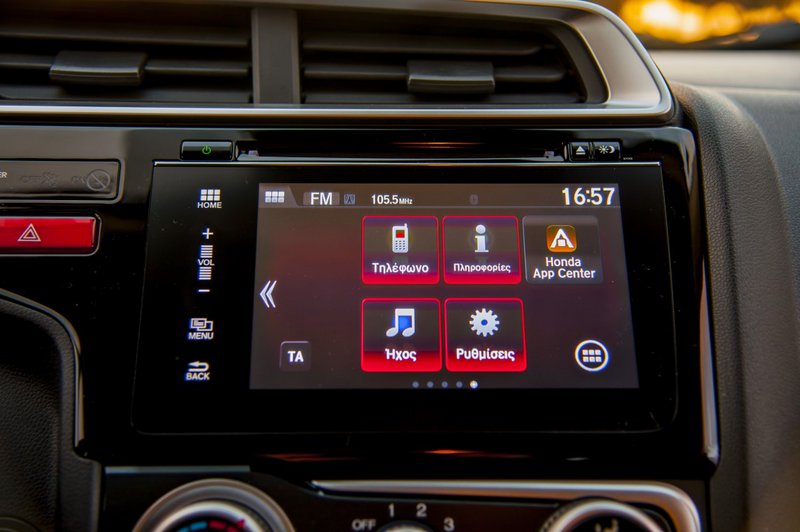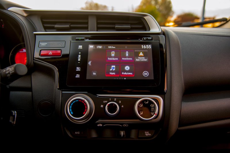 Δείχνει πιο σοβαρό και hi-tech. Εχει μια οδηγοκεντρική προσέγγιση, με την κεντρική κονσόλα να «κοιτά» τον οδηγό. Τα χρώματα είναι σοβαρά, σκούρα με πινελιές βαφής αλουμινίου που τονίζουν τον τεχνολογικό προσανατολισμό του αυτοκινήτου. Η διάταξη των οργάνων είναι διαφορετική με κεντρικό μεγάλο ταχύμετρο αλλά η πλειάδα συστημάτων που ρυθμίζονται μέσω διακοπτών στο τιμόνι απαιτούν χρόνο εξοικείωσης. Ψηλά στο κέντρο του ταμπλό δεσπόζει η οθόνη αφής επτά ιντσών, με το νέο infotainment σύστημα, Honda Connect. Περιλαμβάνει λειτουργικό Android και συνεργάζεται άψογα με τα περισσότερα κινητά για προβολή μέσω Mirrorlink. Τα μενού του δε είναι εύκολα και πλούσια. Ολα είναι όμορφα τοποθετημένα με άφθονες θήκες για μικροπράγματα, όπως μας έχει συνηθίσει η ιαπωνική σχολή. Τα εμπρός καθίσματα από την άλλη, bucket δεν είναι, έχουν όμως πιο σκληρή γόμωση και κρατούν καλύτερα το σώμα συγκριτικά με το προηγούμενο Jazz.