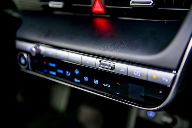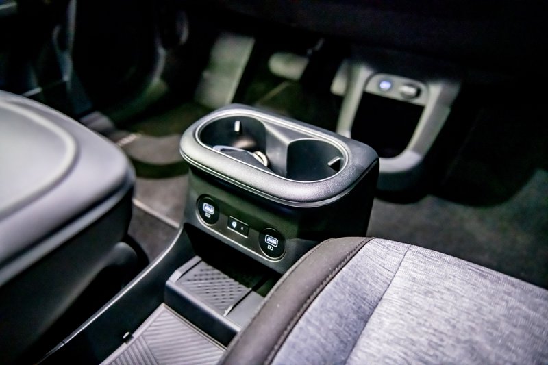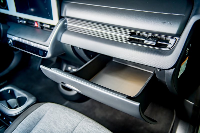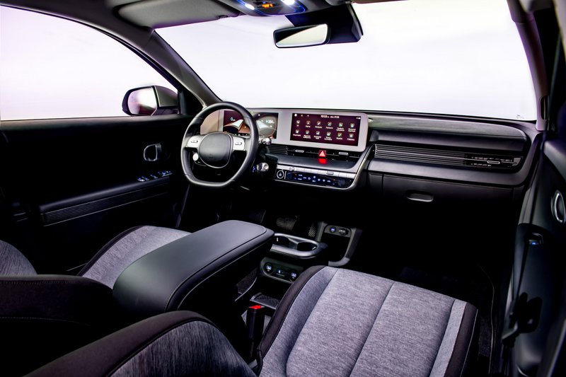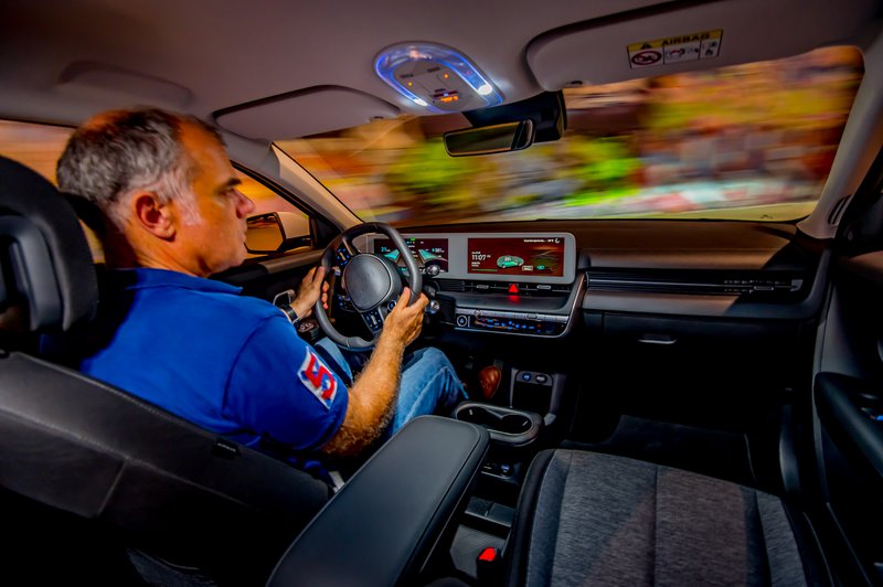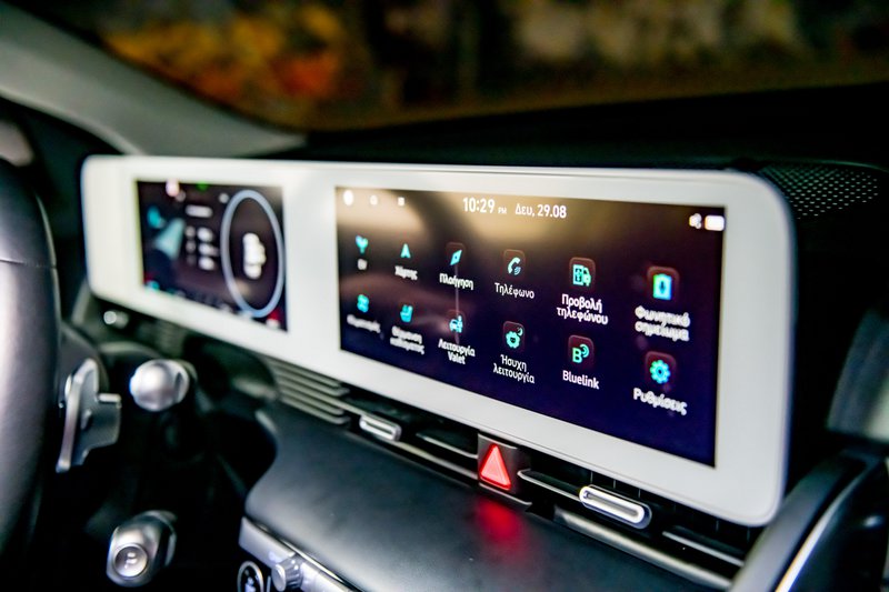 Μέχρι και το ντουλάπι εμπρός από τον συνοδηγό είναι ένα τεράστιο συρτάρι. Τα πλαστικά είναι όμορφα συναρμολογημένα, με αυτά που επενδύουν το επάνω μέρος του ταμπλώ να είναι μαλακά στην υφή. Τα καθίσματα έχουν όμορφα ανάγλυφα υλικά, με μεγάλα έδρανα για τα εμπρός και πίσω, αλλά με πλημμελή στήριξη για τη μέση. Προφανώς, την παράσταση εδώ κλέβει η ενοποίηση των δύο ψηφιακών οθονών 12,3" με πλήρη ελληνικά μενού, εξαιρετικό περιβάλλον πληροφοριών (αν και λίγο μικρές γραμματοσειρές), από τα οποία μπορείς να διασυνδεθείς να παρακολουθήσεις τη ροή ενέργειας ή να καλιμπράρεις τα… 21 συστήματα ασφαλείας υπό το σχήμα Hyundai Smart Sense. Α! και οι λευκές κορνίζες των οθονών, που τόσο μα τόσο ξεφεύγουν από τη σκούρα πεπατημένη των ημερών μας.