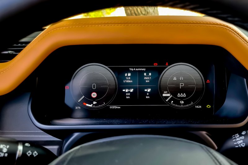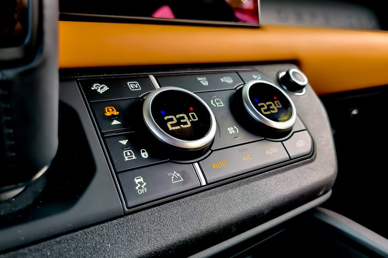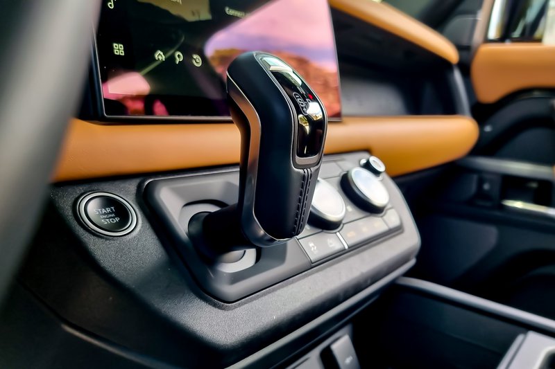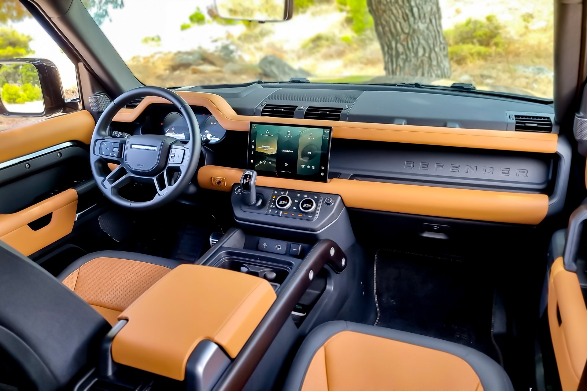 Κατά τ’ άλλα, το τιμόνι μπορεί να μην είναι γρήγορο (δεν θα μπορούσε, άλλωστε, να είναι σε ένα τέτοιου τύπου τετρακίνητο), αλλά προσφέρει καλή πληροφόρηση στον οδηγό, ο οποίος αντιμετωπίζει μια προοδευτική και ελεγχόμενη συμπεριφορά στις στροφές, που σε καμιά περίπτωση δεν τον προβληματίζει. Ενώ στον ανοιχτό δρόμο απολαμβάνει και την άνεση και την ευστάθεια που χαρακτηρίζει το Defender P400e. Και εντέλει το μόνο που μπορεί να τον ξενίσει είναι το γεγονός ότι τα θηριώδη φρένα (δίσκοι 380 mm με εξαπίστονες δαγκάνες εμπρός / 365 mm πίσω) είναι μεν αποτελεσματικά, απαιτούν, ωστόσο, μια εξοικείωση, καθώς χρειάζεται να πατάς πιο αποφασιστικά – και με μεγαλύτερη δύναμη– το σχετικό πεντάλ (στο πρώτο άγγιγμα νομίζεις ότι το σύστημα πέδησης δεν θα ανταποκριθεί στις απαιτήσεις σου). Σημειώνουμε τέλος ότι για τον οδηγό που θα θελήσει κάτι παραπάνω σε επίπεδο ελέγχου του Land Rover, προσφέρεται η δυνατότητα χειροκίνητων/σειριακών αλλαγών ταχυτήτων με τη βοήθεια του επιλογέα τύπου joystick στο ταμπλώ.