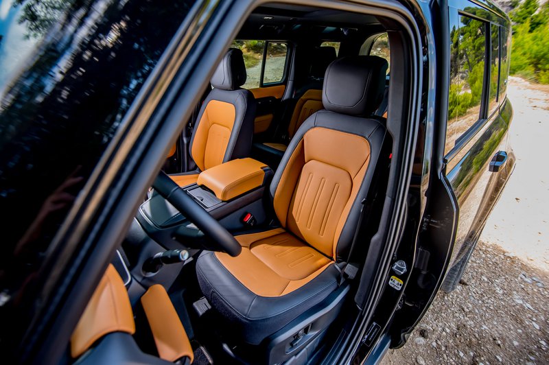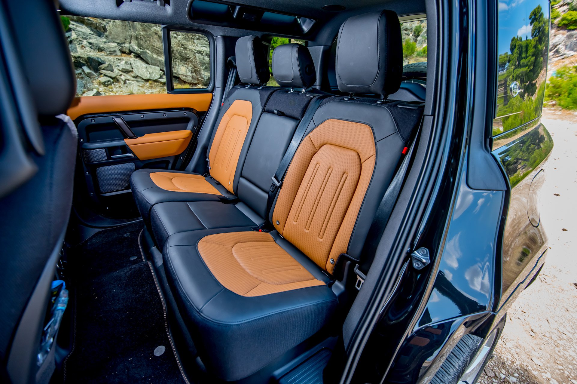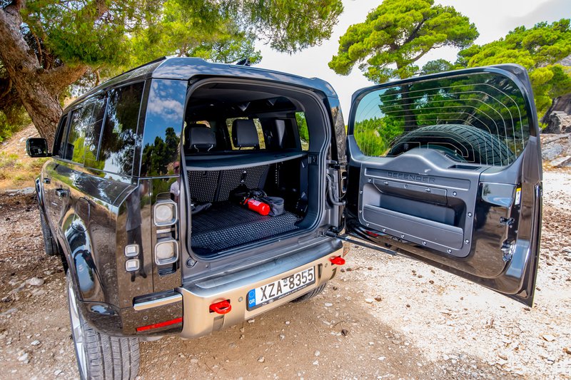Οι χώροι δεν θα μπορούσαν παρά να είναι τεράστιοι μπρος-πίσω - και πραγματικά πίσω μπορείς να κάτσεις ακόμα και σταυροπόδι, όσο ψηλός και αν είσαι. Το εμβαδόν των μαξιλαριών της βάσης των καθισμάτων θα το θέλαμε ένα κλικ μεγαλύτερο, αν και θα μπορούσε κανείς να πει ότι αυτό είναι ένα στοιχείο που εντάσσεται στη λογική του original τετρακίνητου. Εκεί που τα πράγματα δεν είναι και τόσο καλά είναι στο πορτμπαγκάζ, που φιλοξενώντας κάτω από το πάτωμά του την μπαταρία του υβριδικού συστήματος, βρίσκεται να μην προσφέρει μία αντίστοιχη των εξωτερικών διαστάσεων του Defender χωρητικότητα – τουλάχιστον αν επιχειρήσεις να το φορτώσεις μέχρι το ύψος της μαλακής εταζέρας.