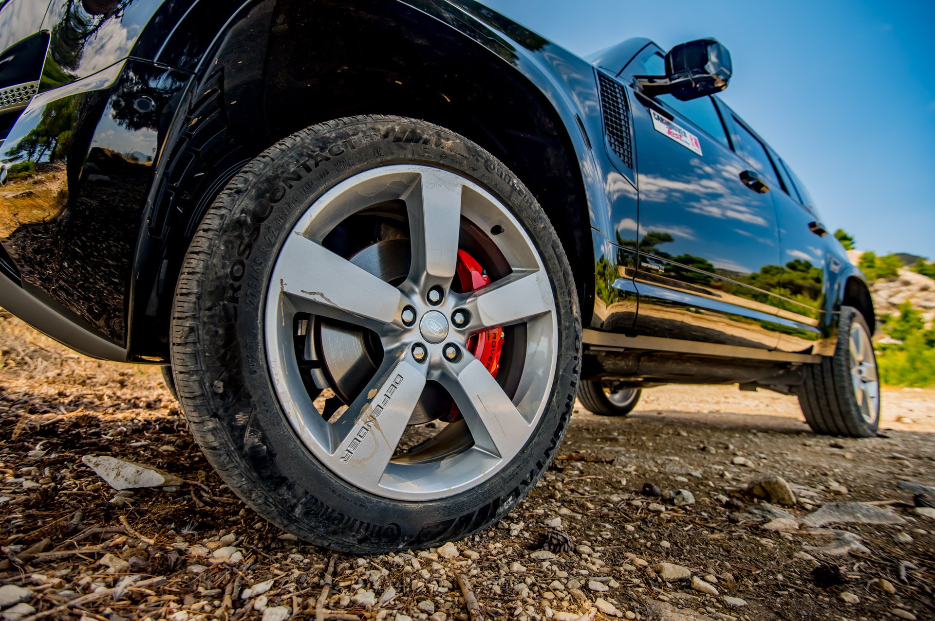 Δεν τελειώσαμε, όμως, με το χώμα: Μέγας σύμμαχος στις εκτός δρόμου αναζητήσεις του οδηγού το σύστημα μετάδοσης της κίνησης στους τέσσερις τροχούς, που υλοποιείται με τη βοήθεια τριών διαφορικών και ενισχύεται από τη δυνατότητα επιλογής κοντών σχέσεων. Όταν όλα αυτά τα μηχανικά μέρη είναι και ηλεκτρονικά ελεγχόμενα, υποστηριζόμενα από αντίστοιχα οδηγικά προφίλ δεν μένουν και πολλά να ζητήσεις... Και αν τα ελαστικά Continental Crosscontact σάς φανούν λίγο… υπερβολικά με τις 22άρες ζάντες σκεφτείτε ότι με το πλάτος τους να φτάνει στα 275 mm έχουμε εντέλει ένα υπολογίσιμο σε ύψος προφίλ – και ας παραπέμπει η διάσταση 275/45-R22 σε κάτι «χαμηλό». Και παρ’ όλο που δεν είναι καθαρόαιμα οff road (σημειώστε ότι έχουμε να κάνουμε με δείκτη ταχύτητας W) τα συγκεκριμένα λάστιχα, η ένδειξη M S (Mud&Snow) στο πλαϊνό τους αποτελεί εγγύηση για σωστή συμπεριφορά και στο χώμα.