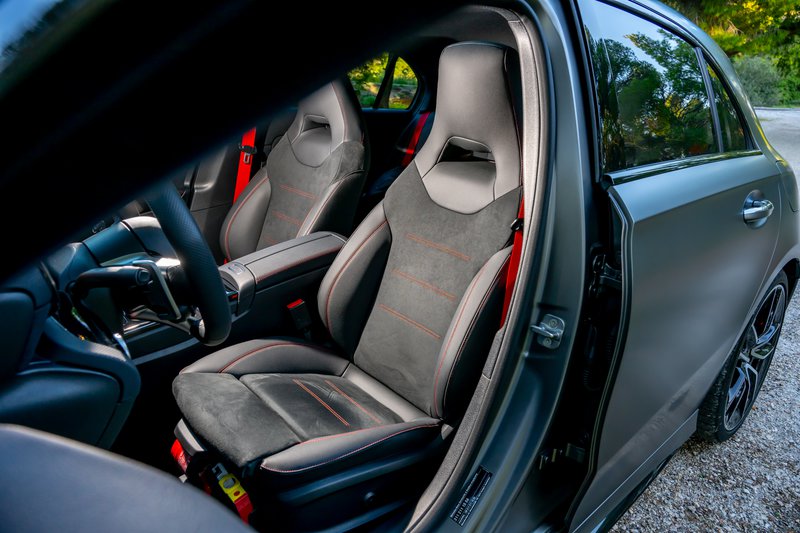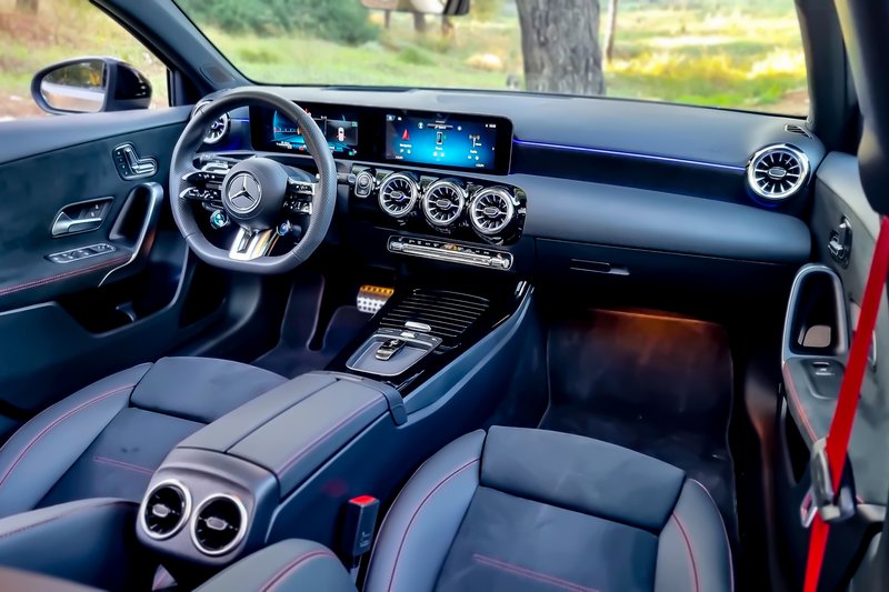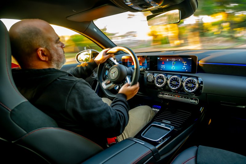 Ένας κινητήρας, όμως, δεν αρκεί για τη δημιουργία ενός αρμονικού συνόλου. Το πλαίσιο είναι εξαιρετικά άκαμπτο και δείχνει απαθές, ακόμα και όταν εσύ πιέζεις στο όριο. Η ανάρτηση είναι σφιχτή, αλλά τη νιώθεις να συνεργάζεται με το ανάγλυφο του δρόμου μεγιστοποιώντας την πρόσφυση. Θα θέλαμε, ωστόσο, λίγο μεγαλύτερη απόσταση από το έδαφος για τους ελληνικούς δρόμους. Η τετρακίνηση συμβάλλει και εκείνη, με τη σειρά της, ώστε η ροπή των 400 Nm να περνά πάντα αποτελεσματικά στον δρόμο, ενώ τα φρένα είναι φανταστικά στο μάτι, αλλά και στην απόδοση. Είτε κινείσαι στην πόλη είτε στον ανοικτό δρόμο, είτε σε κάποια στριφτερή διαδρομή, η Α 35 είναι εξαιρετική συντροφιά. Προσαρμόζεται στη διάθεσή σου μέσα από τα προφίλ οδήγησης που μπορείς να επιλέξεις από το περιστροφικό χειριστήριο που βρίσκεται πάνω στο νέο τιμόνι AMG Performance. Σε πρώτη ματιά, θυμίζει τιμόνι από F1 με τις διάφορες επιλογές που δίνει στον οδηγό. Ωστόσο, στην πράξη θέλει συνήθεια, μιας και οι λειτουργίες είναι μάλλον περισσότερες από αυτές που θα ήθελες για τον δρόμο.