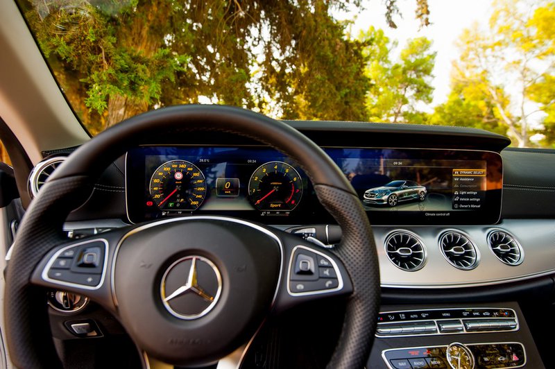 Από τη θέση του οδηγού δεν υπάρχει κανένα παράπονο. Όλα τα χειριστήρια και οι δύο... οθονάρες (μία για τον πίνακα οργάνων και μία για το infotainment) βρίσκονται σε ιδανική θέση, με αποτέλεσμα η οδήγηση της E-Class Cabrio να είναι παιχνιδάκι. Απλώς, επειδή ο διακόπτης των alarm είναι κάτι που πρέπει στην πλειονότητα των περιπτώσεων να πιεστεί άμεσα, θα θέλαμε είτε να βρίσκεται πιο κοντά στον οδηγό είτε να είναι ένα άλλο, μεγαλύτερων διαστάσεων πλήκτρο.
