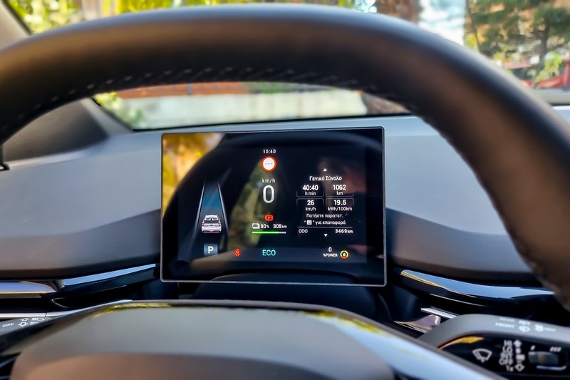 Σε αντίθεση με την εξωτερική σχεδίαση, που χαρακτηρίζεται από έντονη εξωστρέφεια και δυναμισμό, στο εσωτερικό πέφτουν οι τόνοι και αυτό είναι κάτι θεμιτό, μιας και στην καμπίνα περνάμε πολλές ώρες, οπότε οι καθαρές και απλές γραμμές κρατούν τους επιβάτες πιο ξεκούραστους. Έτσι, στο πάνω μέρος του ταμπλώ, που είναι ντυμένο με μαλακό πλαστικό, συναντάμε την οθόνη που εκτελεί χρέη πίνακα οργάνων και μια οθόνη στο κέντρο 10,25” που ουσιαστικά αποτελεί το κέντρο ελέγχου της κατασκευής. Χαρακτηρίζεται από υψηλή ευκρίνεια ωστόσο θα θέλαμε κάποιες λειτουργίες, όπως η επιλογή προφίλ οδήγησης αλλά και ο κλιματισμός να έχουν και φυσικά χειριστήρια εκτός οθόνης.