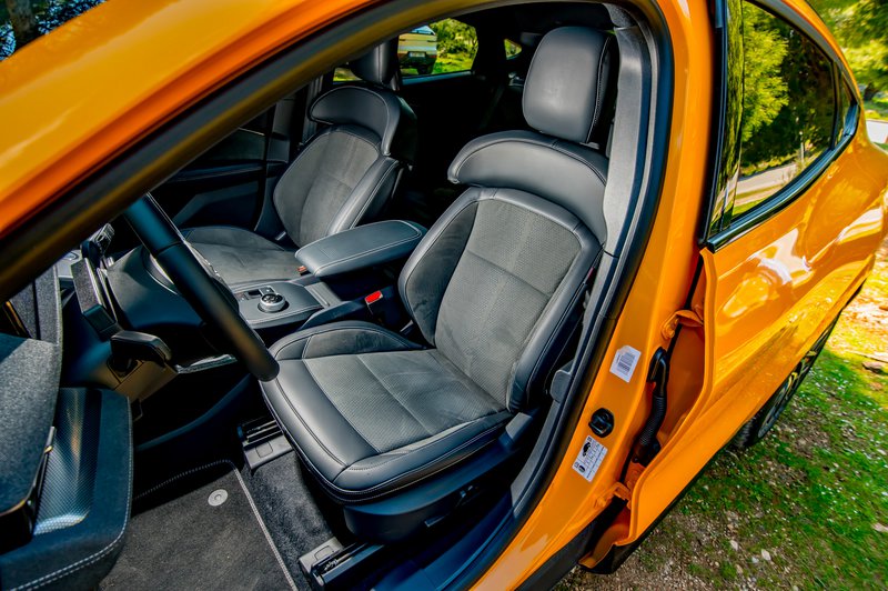 Το εσωτερικό εξακολουθεί να είναι ευρύχωρο, ποιοτικό για τα δεδομένα της κατηγορίας (mainstream κατασκευαστής ηλεκτρικό) και εξαιρετικά πρακτικό. Κι εδώ αυτά που δεσπόζουν και μας έλειψαν μέχρι σήμερα είναι τα σπέσιαλ καθίσματα της Ford Performance για οδηγό και συνοδηγό με επαρκέστερη πλευρική στήριξη (θα θέλαμε, όμως, ακόμα πιο πολλή στήριξη για τους μηρούς).