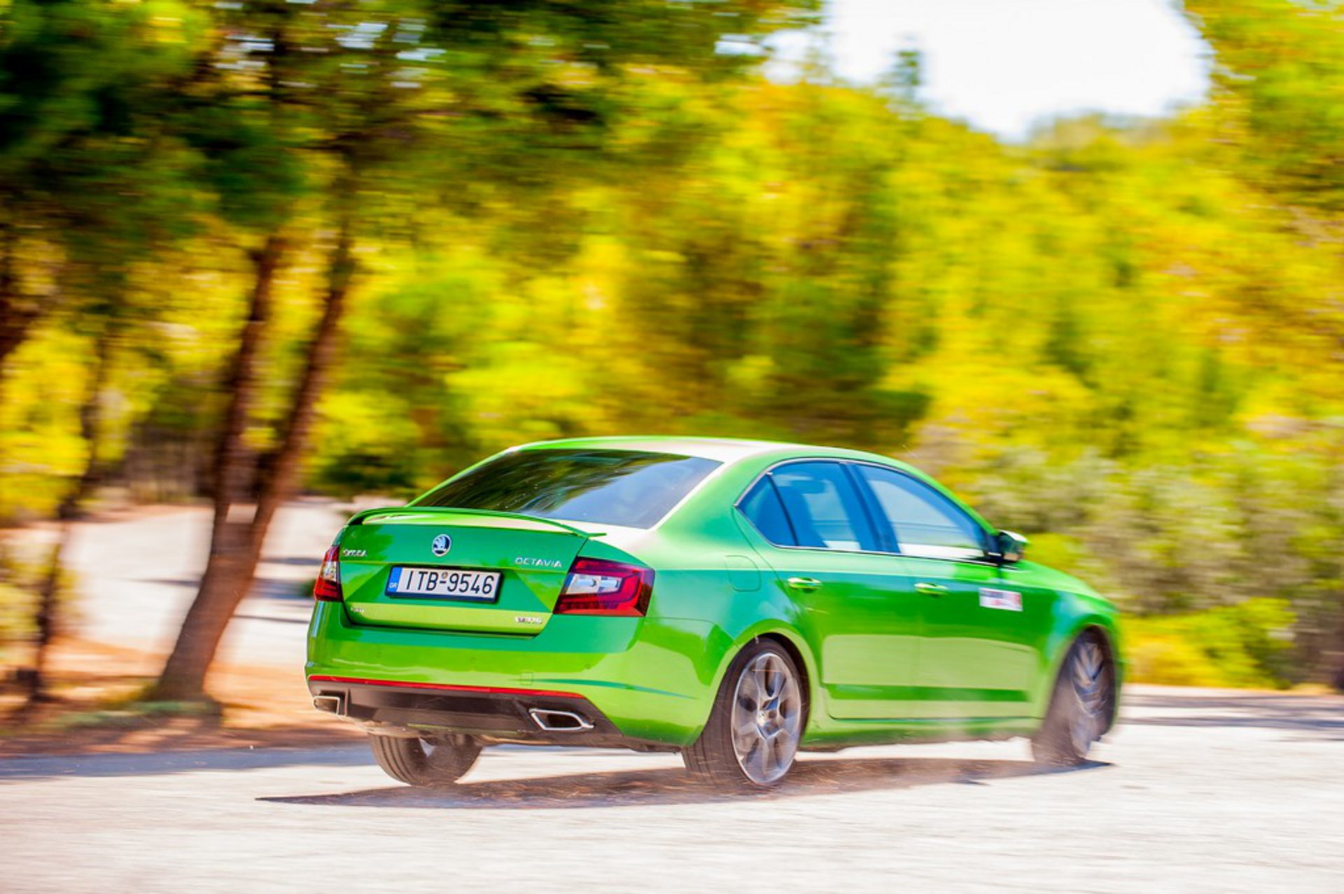 Από την άλλη λεπτοµέρειες όπως οι κόκκινες δαγκάνες, η διακριτική πίσω αεροτοµή και οι απολήξεις της εξάτµισης κάτω χαµηλά προδίδουν κάτι από τον σπέσιαλ χαρακτήρα του. Η δε εµπρός µάσκα µε το σηµατάκι VRS είναι σαν το «απαραίτητη η γονική συναίνεση» του τηλεοπτικού δέκτη, ενώ το Rally Green κάνει το Octavia RS να µοιάζει στον Xουλκ.