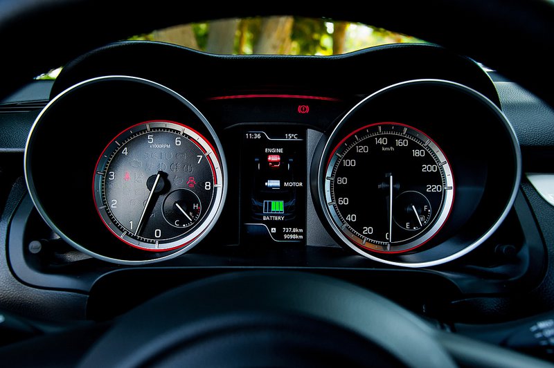 Πού έγκειται το... πράσινο στοιχείο του μικρού ιαπωνικού μοντέλου; Στο συνδυασμό του ατμοσφαιρικού βενζινοκινητήρα 1,2 λίτρων με ένα ήπιο υβριδικό κύκλωμα 12V, το οποίο έχουμε δει ξανά στο Suzuki Ignis. Η ιαπωνική φίρμα αποκαλεί αυτόν το συνδυασμό SHVS, δηλαδή “Smart Hybrid Vehicle (by) Suzuki”. Αυτό το πακέτο, λοιπόν, αποτελείται από έναν εναλλάκτη μέγιστης ισχύος 2,3 kW και ροπής σχεδόν 50 Nm. Με το δυνατό πάτημα του δεξιού πεντάλ, το ηλεκτρικό κύκλωμα του αυτοκινήτου τροφοδοτείται και μετατρέπεται από γεννήτρια σε κινητήρα. Με αυτόν τον τρόπο, λοιπόν, υποστηρίζεται ο κινητήρας εσωτερικής καύσης, βελτιώνεται η απόκριση του γκαζιού και η ροπή, ενώ μειώνεται και η κατανάλωση ειδικά στις εκκινήσεις.